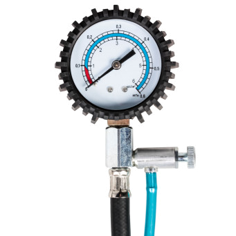 Измеритель состоит из манометра и присоединительной части. Манометр защищён резиновым чехлом.