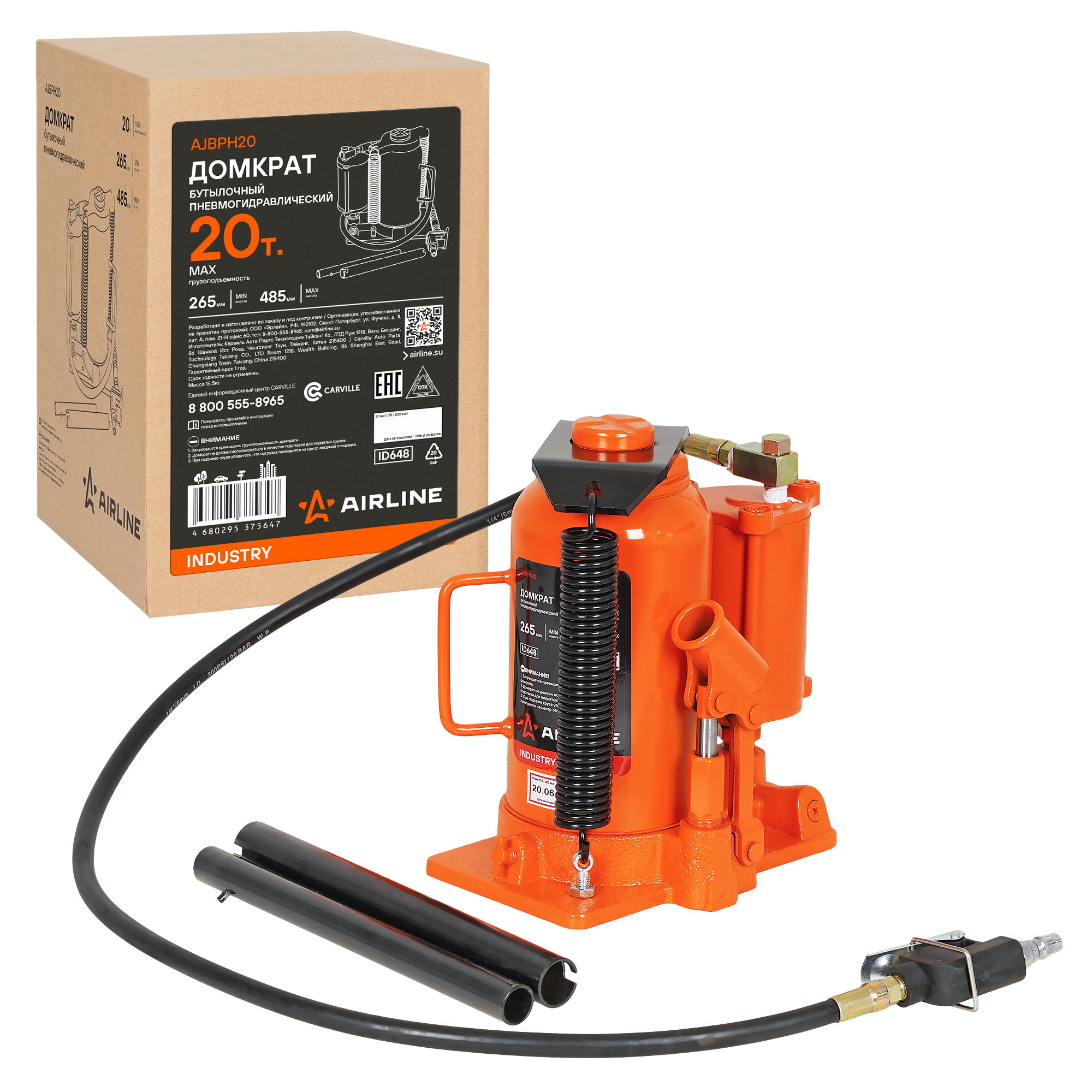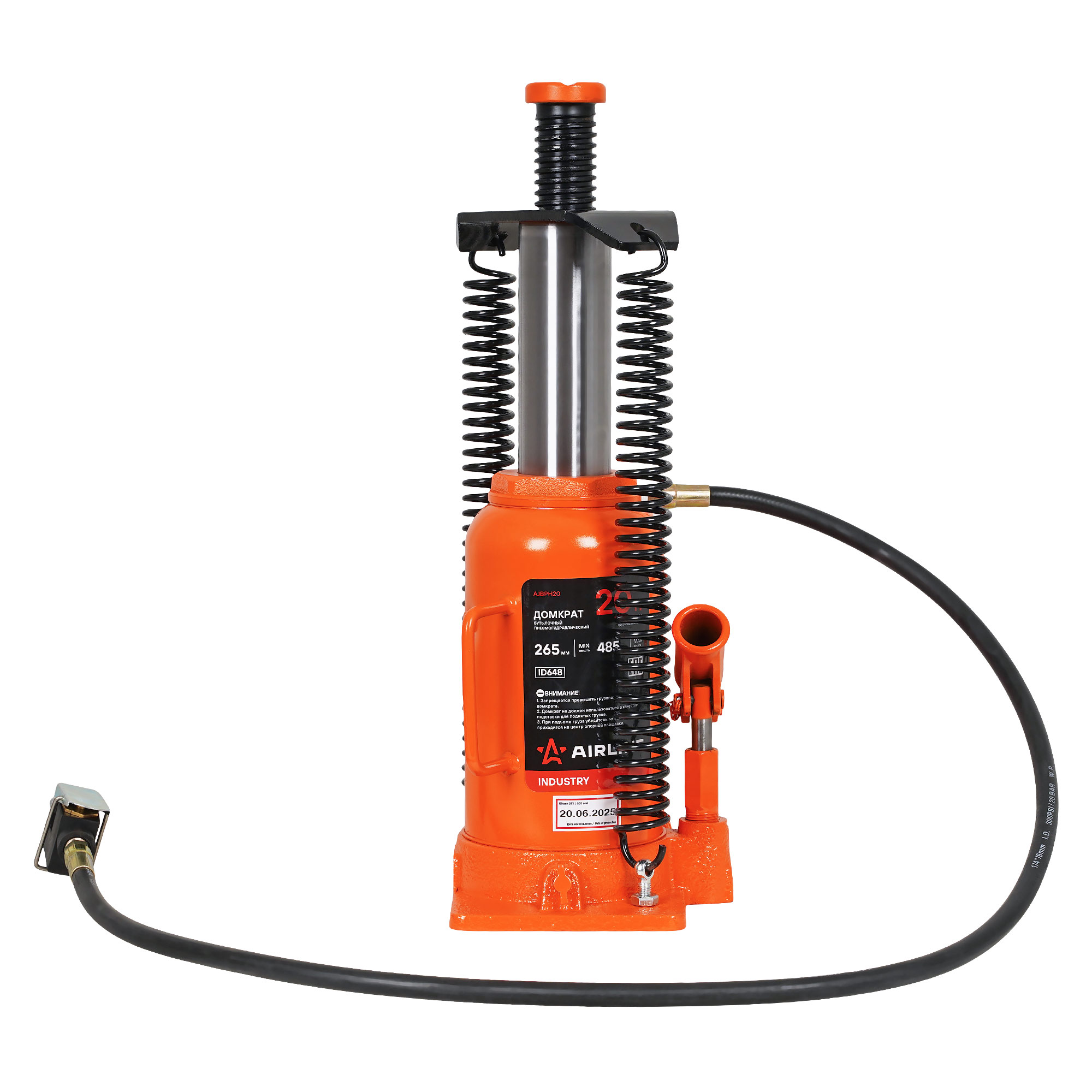 Высота подхвата - 265 мм, высота подъема - 483 мм. Грузоподъемность 20 тонн. Домкрат оснащен шлангом с быстроразъемом для удобной работы длиной 130 см, что позволяет работать на удаленном расстоянии.