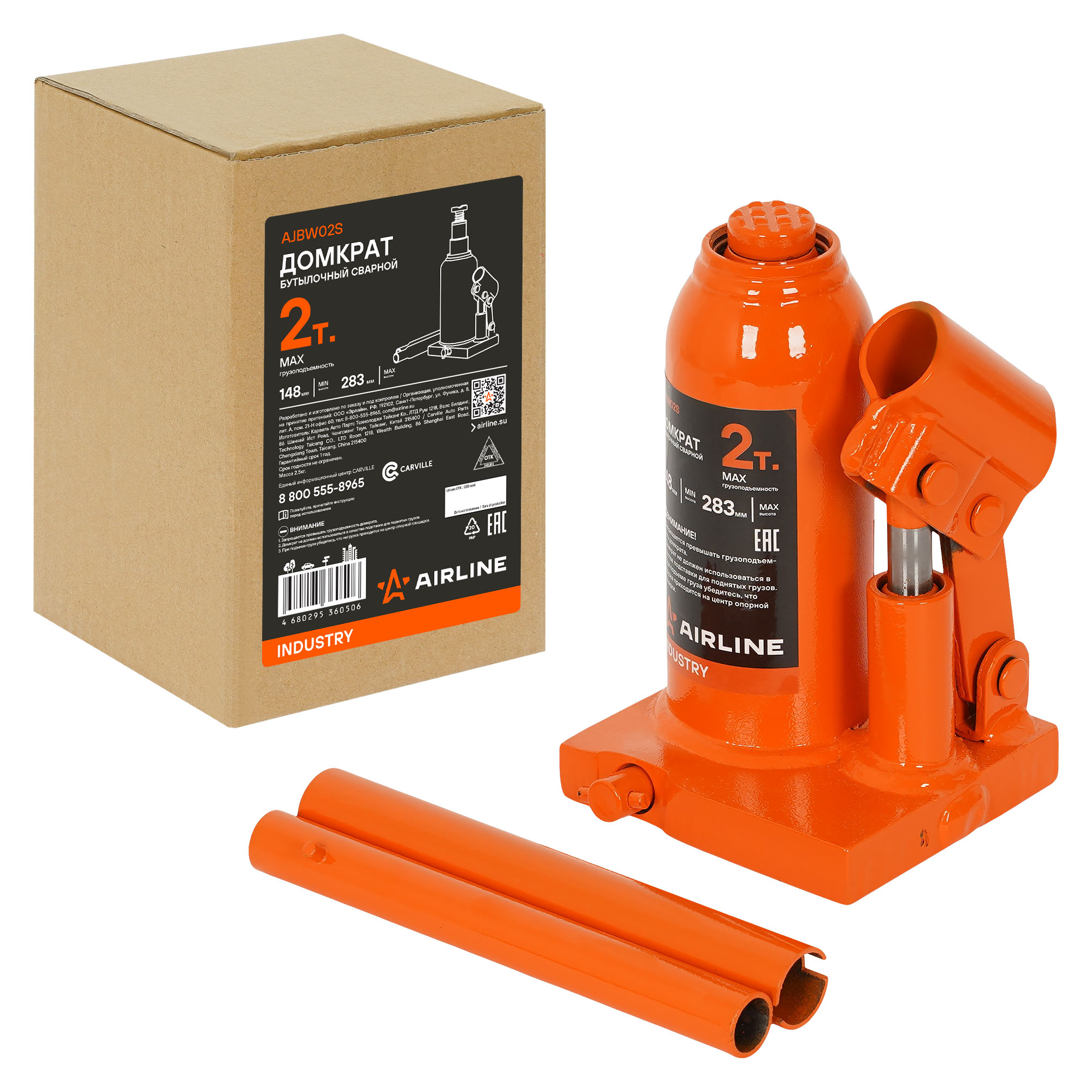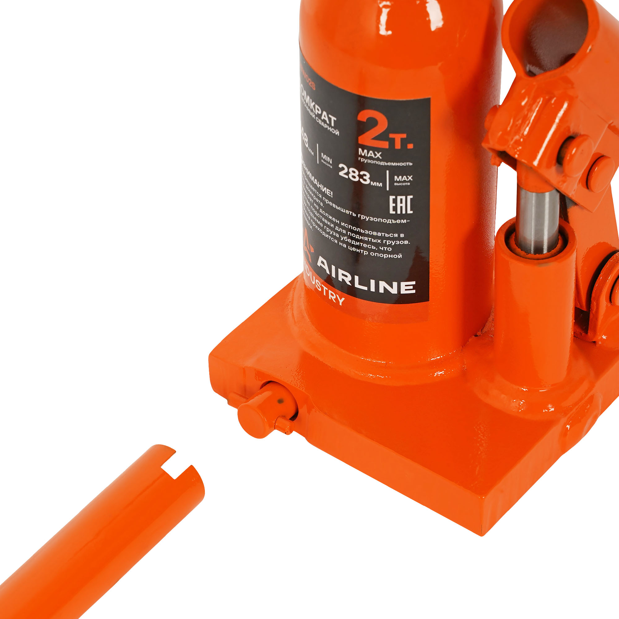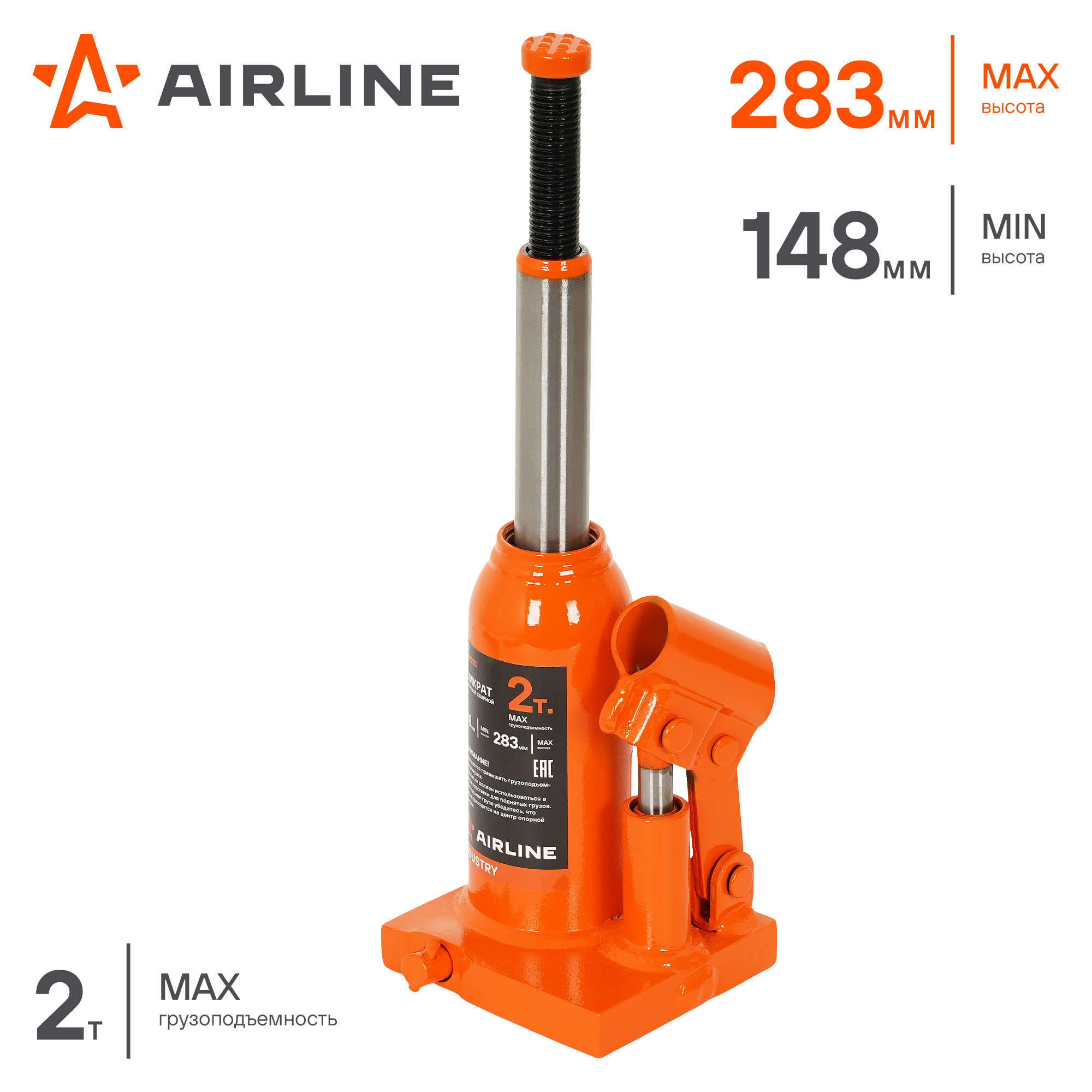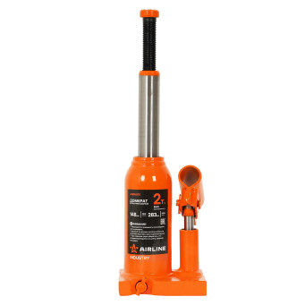 Домкрат бутылочный AIRLINE AJBW02S гидравлический INDUSTRY. Грузоподъемность - 2 т. Высота подхвата - 148 мм. Высота подъема - 283 мм. Благодаря сварной конструкции домкрата, обеспечивает жесткость, исключая перекосы, расшатывание или утечки рабочей жидкости. Широкое и кованное основание домкрата дает устойчивость вовремя подъема груза. Винтовой удлинитель изготовлен из закаленной стали. Полиуретановые кольца, используемые в уплотнениях, обеспечивают высокую износостойкость штока. Морозостойкое масло сохраняет рабочие функции при низких температурах. Оборудование используется при подъеме тяжелой техники: грузовых автомобилей, строительного и сельскохозяйственного оборудования, промышленных агрегатов. Также их применяют на производственных предприятиях, в ремонтных цехах, в сфере строительства.