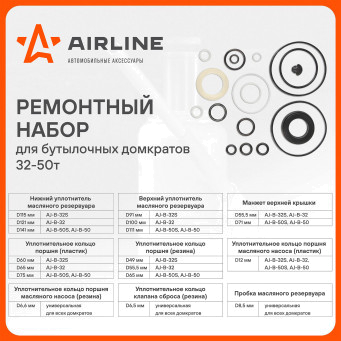 Универсальный ремонтный набор AIRLINE, предназначен для обслуживания бутылочных домкратов. Применим с домкратами следующих артикулов: AJ-B-32S, AJ-B-32, AJ-B-50S, AJ-B-50.