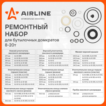 Универсальный ремонтный набор AIRLINE, предназначен для обслуживания бутылочных домкратов. Применим с домкратами следующих артикулов: AJ-B-08, AJ-B-08S, AJ-B-10S, AJ-B-10, AJ-B-12S, AJ-B-12, AJ-B-16S, AJ-B-16, AJ-B-20S, AJ-B-20.