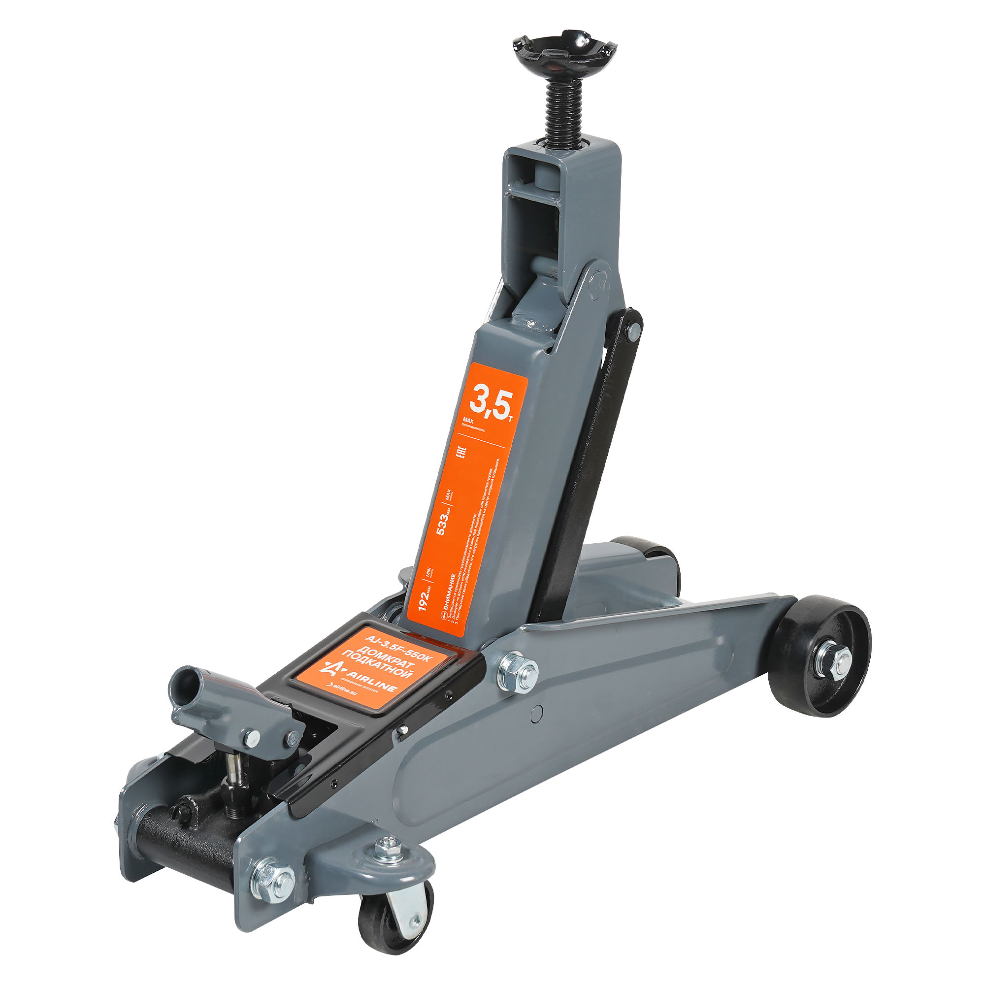 Подкатной домкрат AIRLINE 3.5т с увеличенной высотой подъема. Оснащен чашкой с выдвижным винтом высотой 48 мм, благодаря которому максимальная высота подъема составляет 533 мм. Широко используется в мастерских по ремонту автомобилей и предназначен для обслуживания легкового коммерческого транспорта или внедорожников. Прочная металлическая конструкция защищает устройство от механических повреждений и продлевает срок службы. Домкрат снабжен ремкомплектом поршневых колец. Комплектуется кейсом для удобного хранения и транспортировки. В домкрате используется морозостойкое масло.