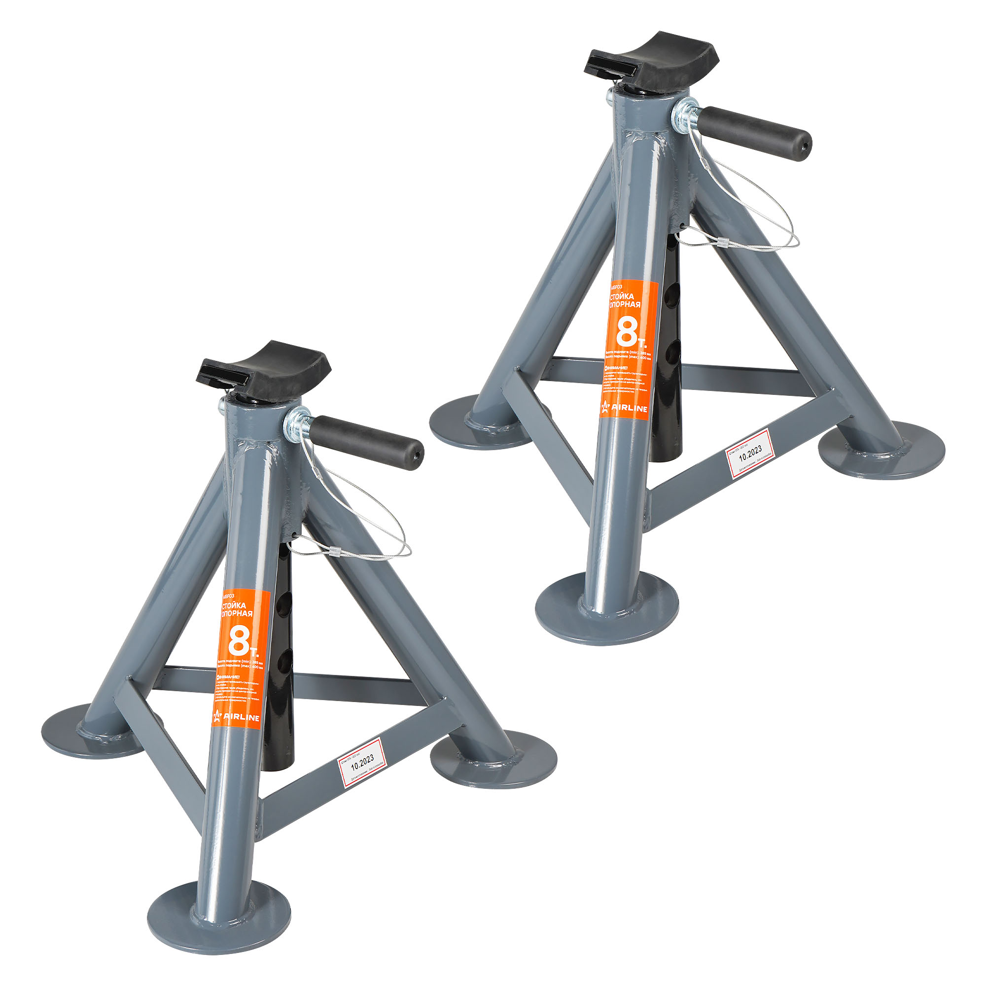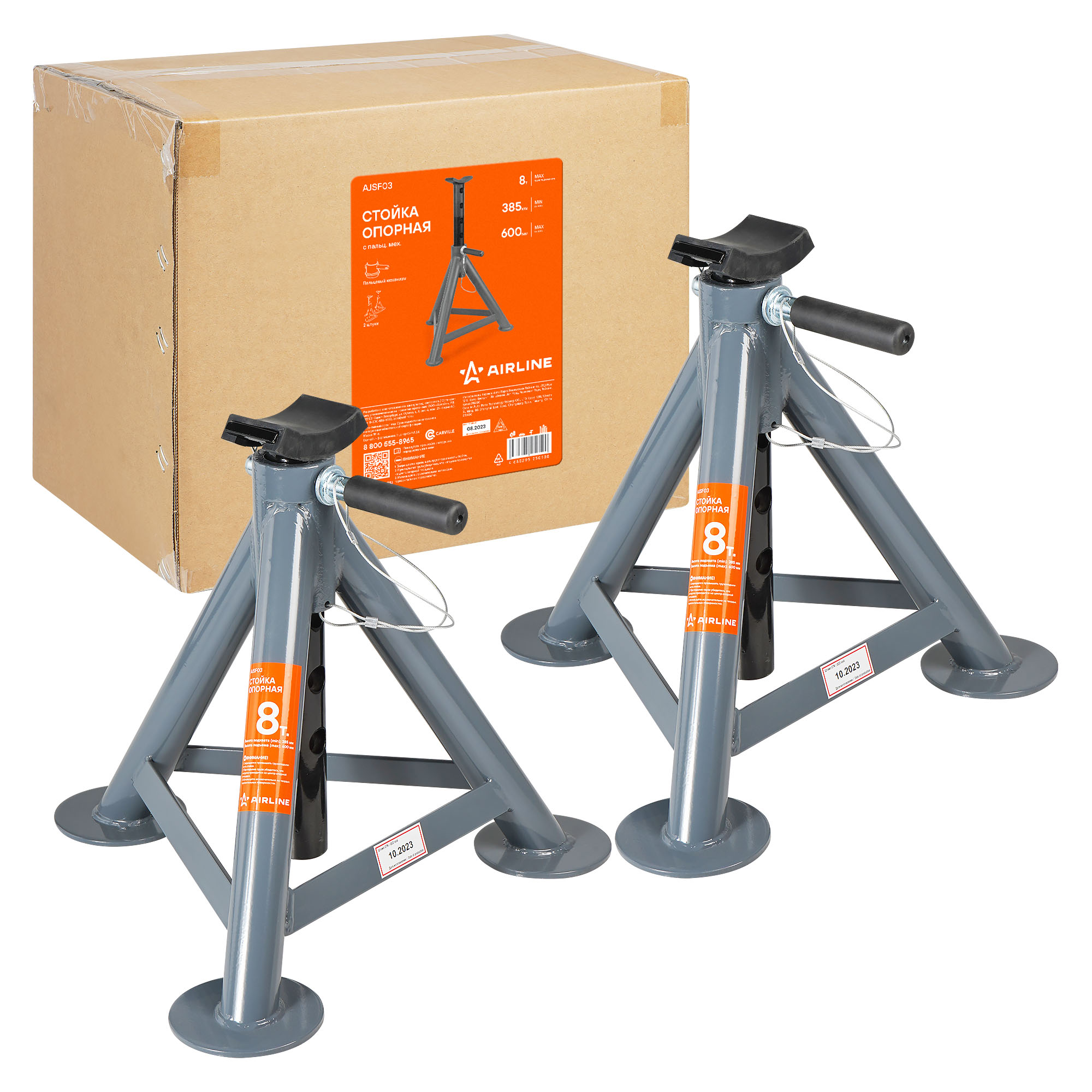 Опорная стойка с пальцевым механизмом AIRLINE 8т, MIN-385 мм, MAX-600 мм применяется как средство страховки и удержания автомобиля на заданной высоте. Стойки устанавливаются под автомобиль в определенных точках (под осями или под специальными площадками на раме). Фиксация производится с помощью пальцевого механизма. В комплекте 2 стойки.