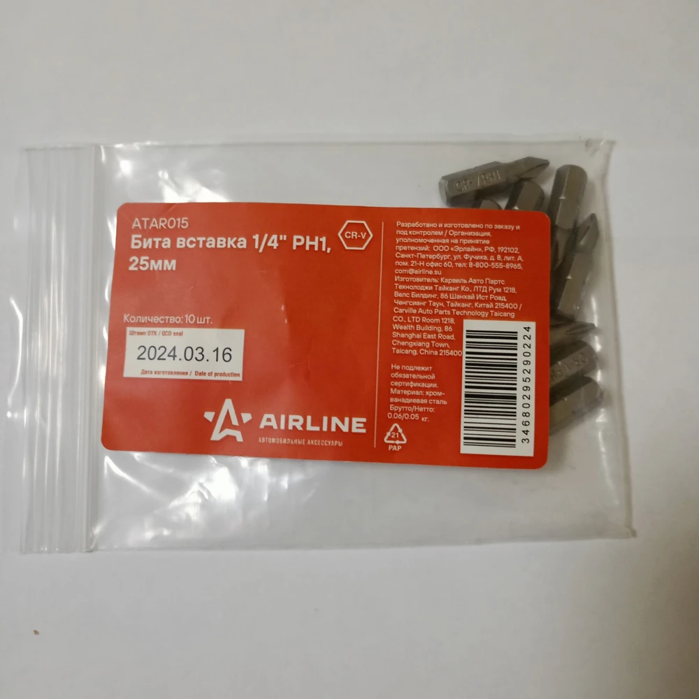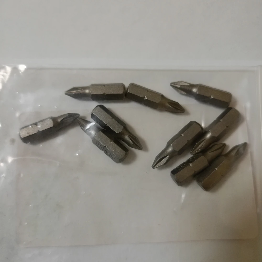 Комплект бит, в количестве 10шт. 1/4" 25мм, пришли быстро, запечатлены в пластиковый пакет. Небольшой размер подойдет под мелкие болты и саморезы. Стандартный размер хвостовика подойдет под любой переходник.