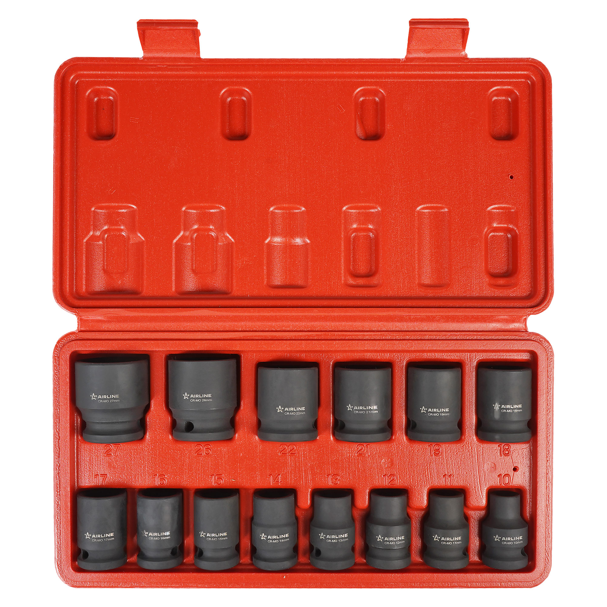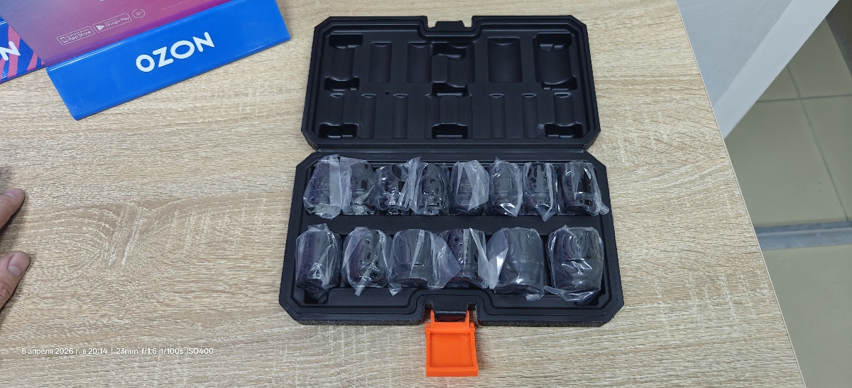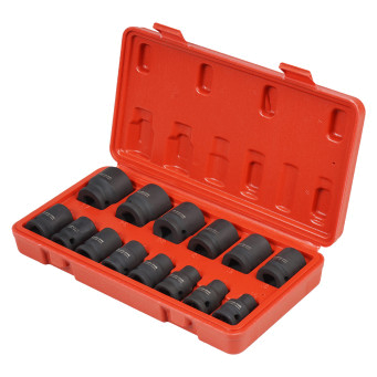 Набор состоит из 14 ударных головок (10,11,12,13,14,15,16,17,18,19,21,22,26,27мм).