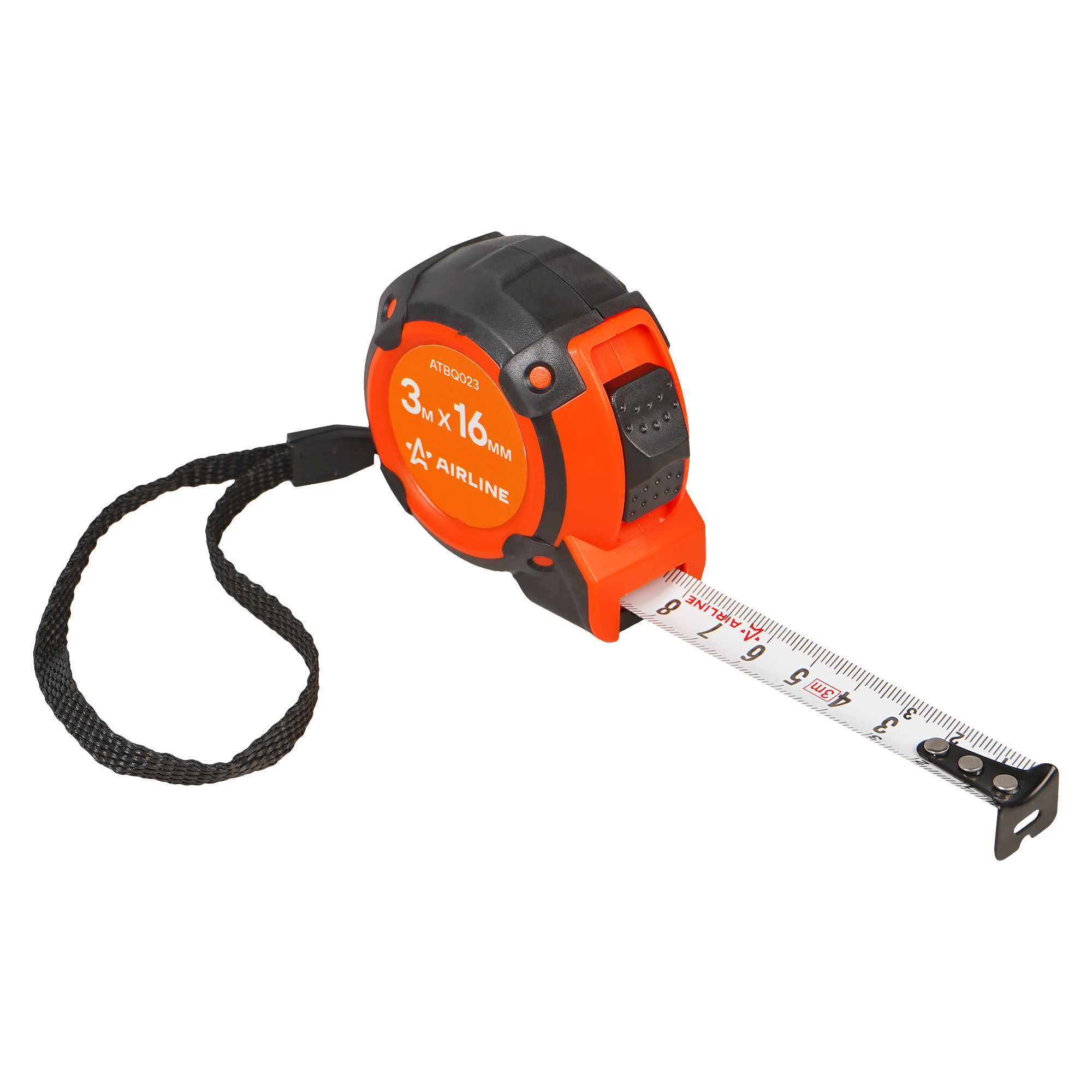 Рулетка AIRLINE ATBQ023 изготовлена из композитного прорезиненного пластика. Матовое покрытие ленты позволяет комфортно считывать числа со шкалы. Зацеп и клипса для ремня окрашены краской, что обеспечивает повышение их антикоррозийных свойств. Рулетка имеет эргономичный дизайн и удобный рычаг фиксации ленты.