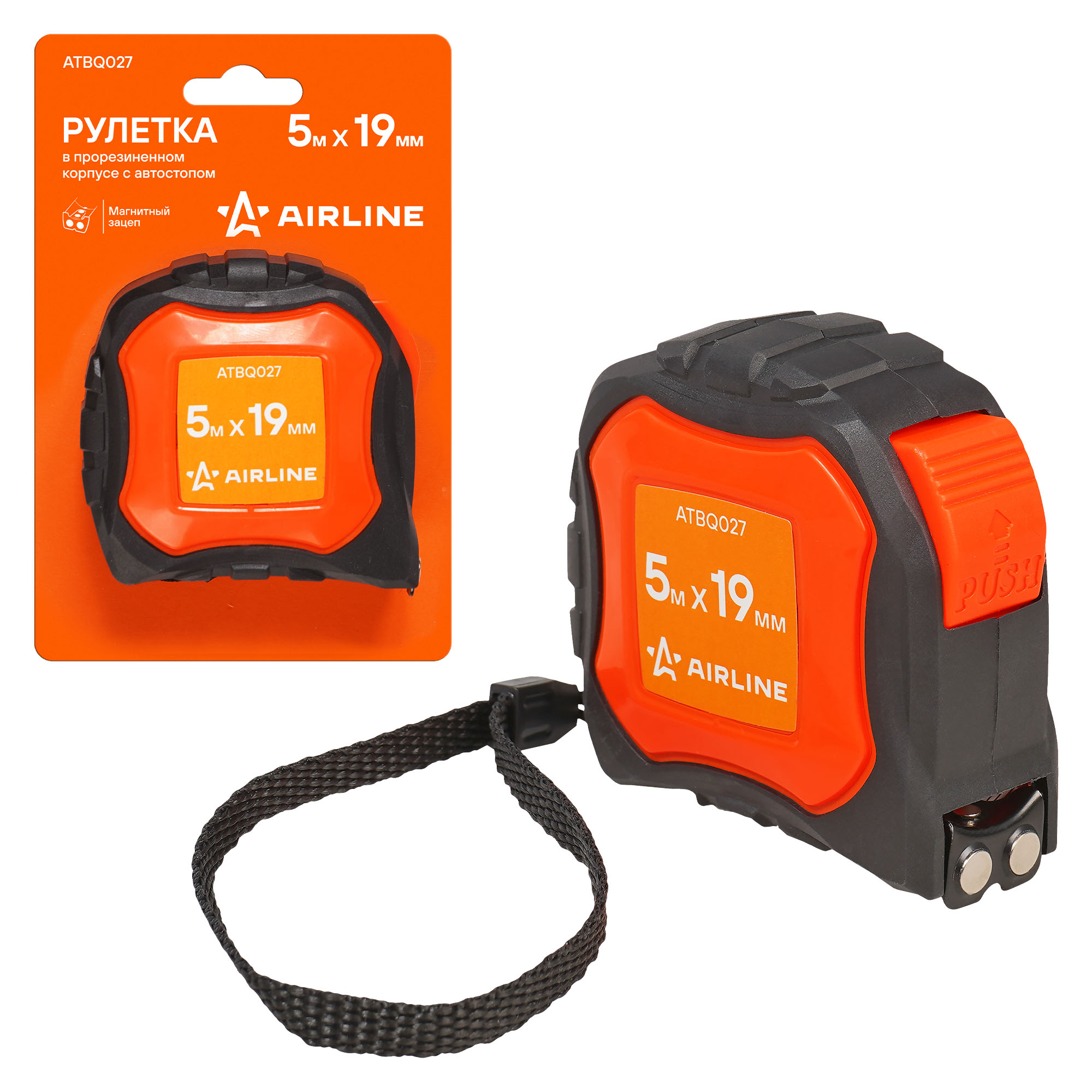 Рулетка AIRLINE ATBQ027 изготовлена из композитного прорезиненного пластика. Специальный механизм самостоятельно блокирует положение ленты, при ее извлечении из корпуса. На рулетке установлен магнитный зацеп, который облегчает измерение и проверку размеров на металлических поверхностях. Матовое покрытие ленты позволяет комфортно считывать числа со шкалы. Зацеп и клипса для ремня окрашены краской, что обеспечивает повышение их антикоррозийных свойств.