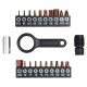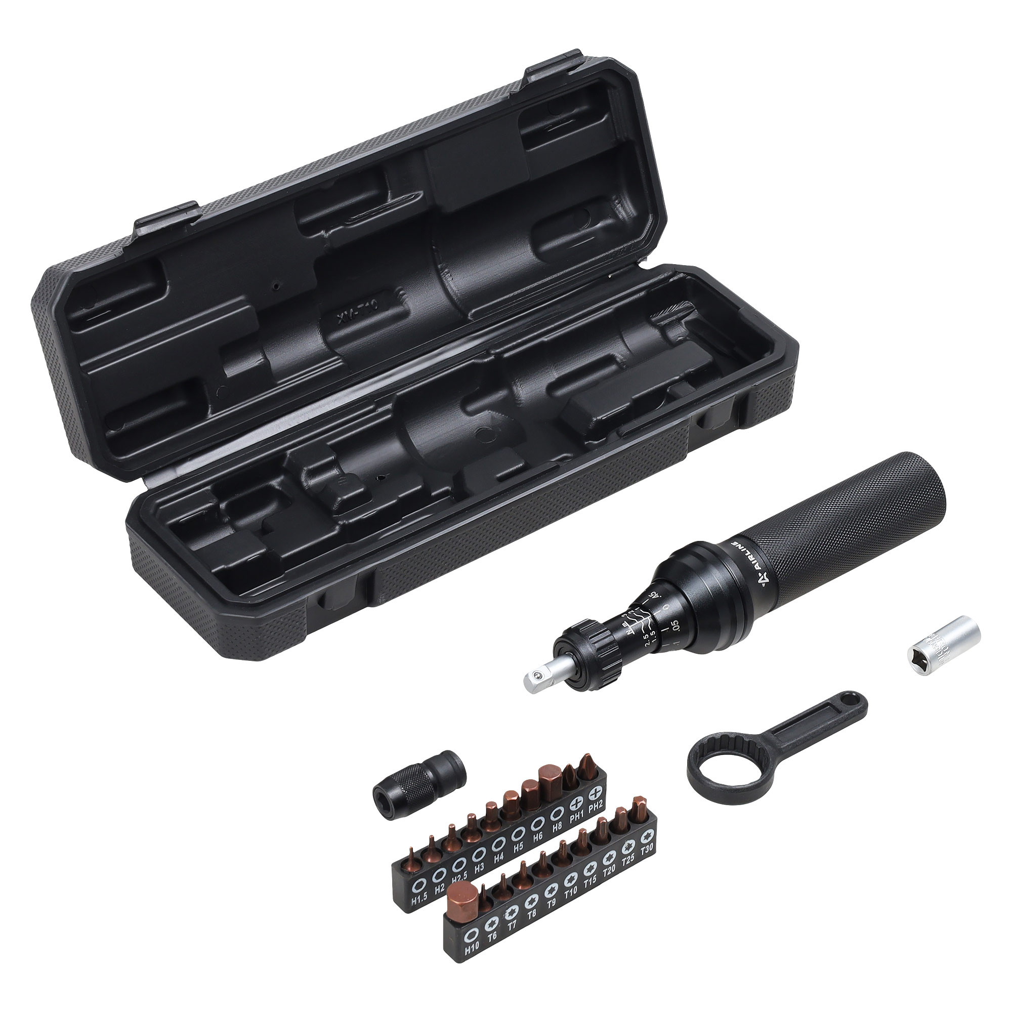 В комплект входят 20 сменных бит из высококачественной стали S2: H10; T6; T7; T8; T9; T10; T15; T20; T25; T30; H1.5; H2; H2.5; H3; H4; H5; H6; H8; PH1; PH2, а также быстросъёмный держатель для бит. Для удобной настройки усилия затяжки в набор также входит специальный ключ, с помощью которого можно легко установить необходимое значение момента на отвертке.