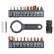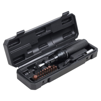 В комплект входят 20 сменных бит из высококачественной стали S2: H10; T6; T7; T8; T9; T10; T15; T20; T25; T30; H1.5; H2; H2.5; H3; H4; H5; H6; H8; PH1; PH2, а также быстросъёмный держатель для бит. Для удобной настройки усилия затяжки в набор также входит специальный ключ, с помощью которого можно легко установить необходимое значение момента на отвертке.
