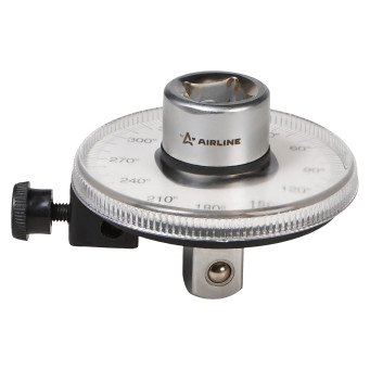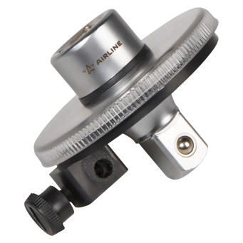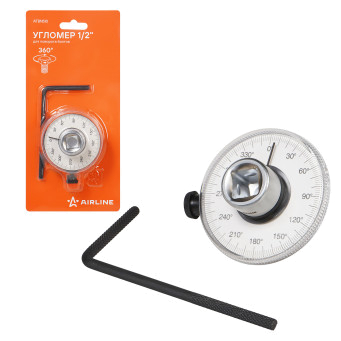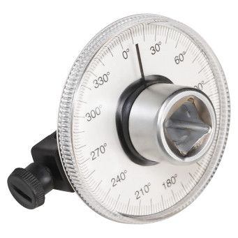 Представляет собой механический измерительный прибор, предназначенный для точного контроля угла поворота крепежа с посадкой 1/2". Инструмент рассчитан на полный оборот в 360° и обеспечивает возможность установки требуемого угла при затягивании болтов, гаек и других резьбовых соединений в автомобиле, промышленном и бытовом оборудовании. Корпус изготовлен из металла и снабжён шкалой с делениями, позволяющей визуально контролировать угол затяжки.