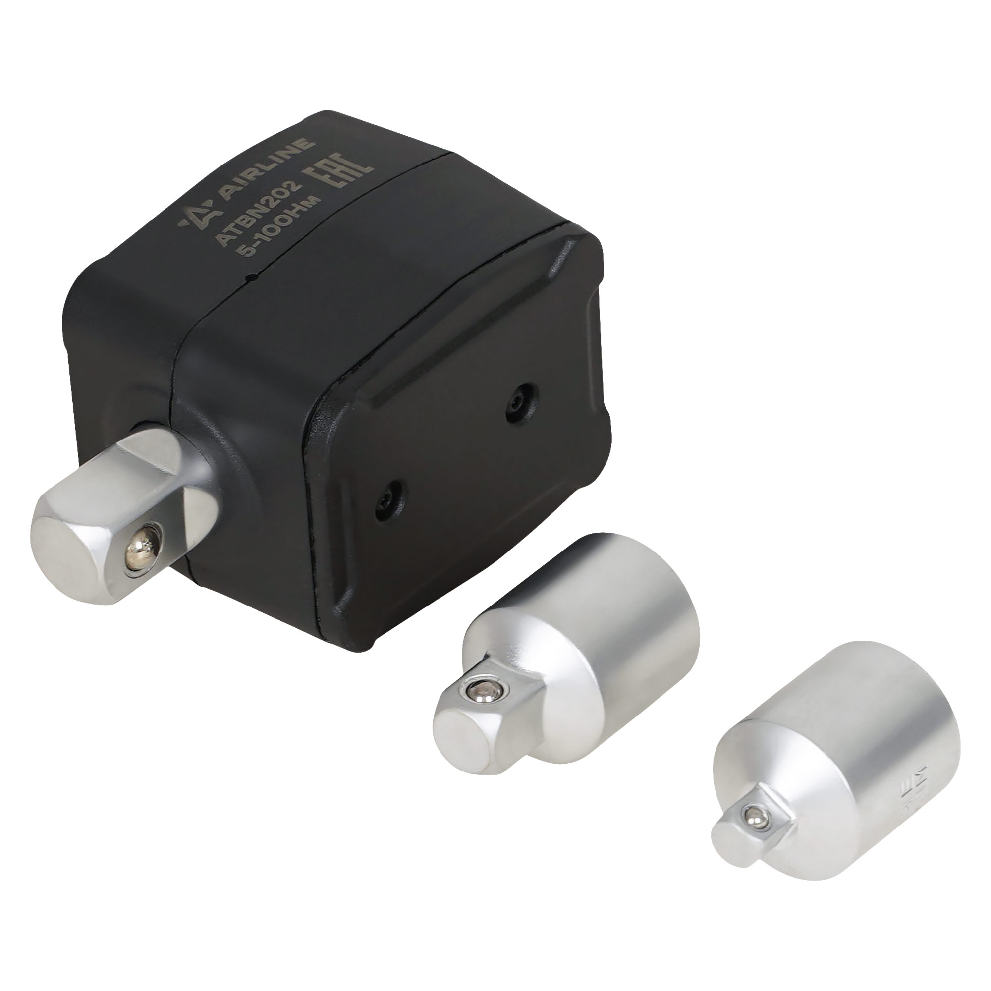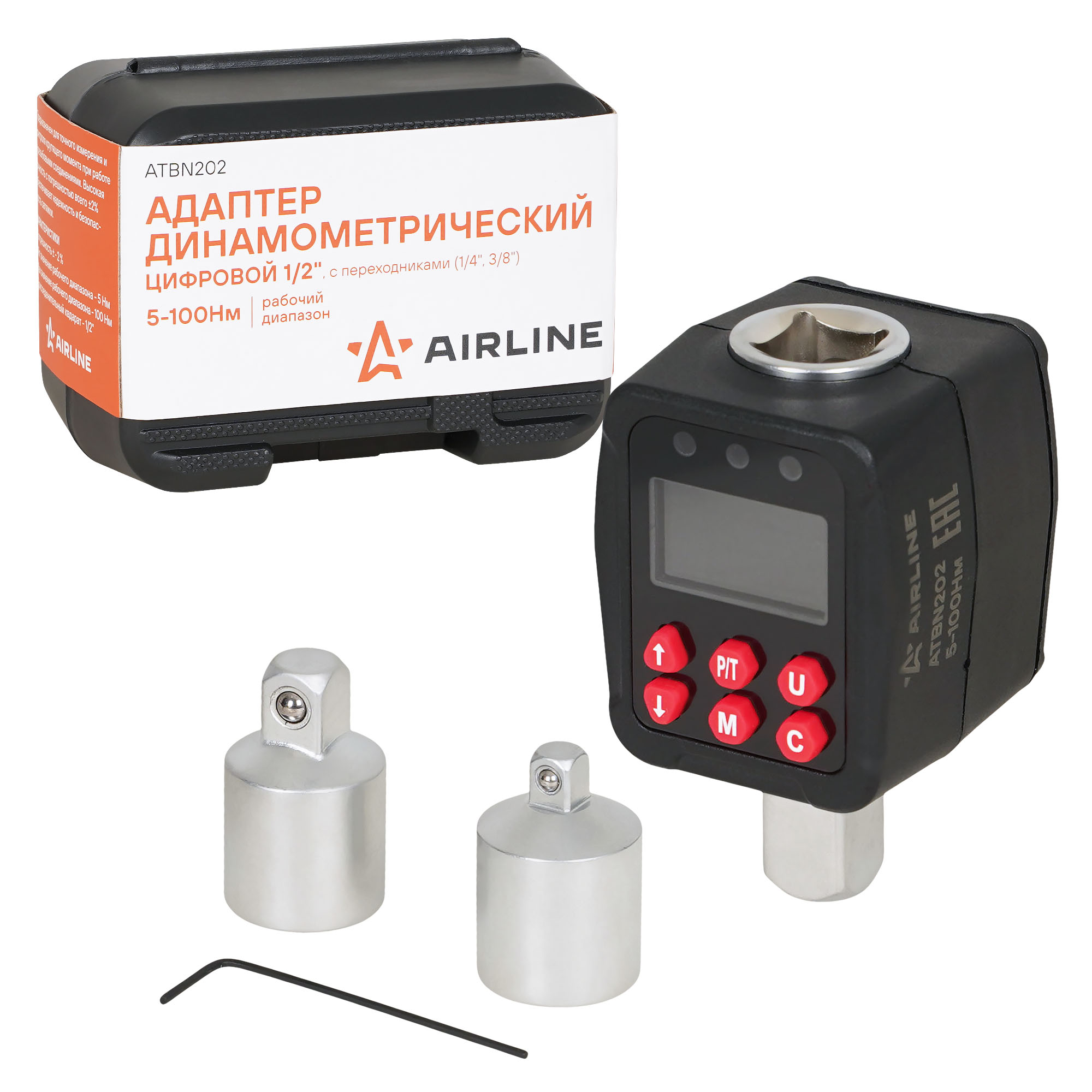 OZON ВсеИнструменты.ру Wildberries Яндекс Маркет ДистрибьюторыДинамометрический цифровой адаптер AIRLINE 1/2", 5–100 Нм, с переходниками (1/4", 3/8") (ATBN202) предназначен для точного измерения и контроля крутящего момента при работе с резьбовыми соединениями. Инструмент подходит для работы с различными крепежными элементами. Высокая точность с погрешностью всего ±2% обеспечивает надежность и безопасность затяжки, предотвращая повреждение резьбы. В комплекте предусмотрены переходники на 1/4" и 3/8", что делает адаптер универсальным для использования с головками разных размеров. Прочный корпус из ударопрочного АБС-пластика защищает устройство от механических воздействий, а компактный кейс упрощает хранение и транспортировку. Цифровой дисплей позволяет легко контролировать усилие затяжки, а в сочетании с трещоткой и торцовыми головками адаптер может использоваться как полноценный динамометрический ключ.
