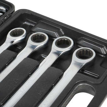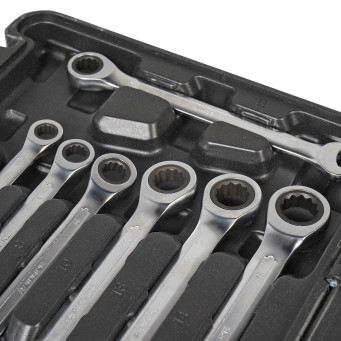 Ключи трещоточные серии PRO изготовлены из высококачественной хром-ванадиевой стали, отличаются высоким запасом прочности, износостойкостью и долговечностью эксплуатации. Способны выдерживать самые интенсивные нагрузки при непрерывной длительной работе. Специальный трещоточный механизм в 72 зуба изготовлен из 50BV30 стали способен выдерживать высокие нагрузки, позволяя работать в труднодоступных местах. Финишное хромированное покрытие защищает ключ от воздействия коррозии. Эргономичный рукоятка развивает большее усилие без риска повреждения кистей рук. Продуманный профиль накидной части ключа предотвращает повреждение болтов и гаек, даже при самых высоких нагрузках. Абсолютно все ключи производятся по единой технологии на современных автоматизированных предприятиях. Тестирование каждого ключа происходит в собственной испытательной лаборатории, что является залогом качества. Надежные и прочные ключи серии PRO станут незаменимым инструментом для любого профессионала.