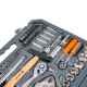 1/4" Головка торцевая 6гр. 4, 5, 6, 7, 8, 9, 10, 11, 12, 13 Головка торцевая удлиненная 6гр. 5, 6, 7, 8, 10 Трещёточная рукоятка 1/4", 72 зуба Отвёрточная рукоятка 1/4" - 1/4" Удлинитель 75мм Карданный шарнир 1/4" Г-образный шестигранный ключ 1.5мм, 2мм, 2.5мм 1/2" Биты 8мм H7, H8, H10, H12, H14, SL 8, SL 10, SL 12, PH 3, PH 4, PZ 3, PZ 4, TX 40, TX 45, TX 50, TX 55, TX 60 Держатель для бит 1/2" - 8мм Головка торцевая 6гр. 10, 11, 12, 13, 14, 15, 17, 18, 19, 22, 24, 27, 30, 32 Головка свечная 16мм, 21мм Трещёточная рукоятка 1/2", 72 зуба Удлинитель 125мм, 250мм Адаптор для Т-образного воротка 1/2" Карданный шарнир 1/4" Ключ комбинированный 10, 11, 12, 13, 14, 15, 17, 19мм Молоток слесарный 300гр Пассатижи комбинированные 180мм Клещи переставные универсальные 250мм Отвертка SL 6.5*38мм, SL 6.5*100мм, PH 2*38мм, PH 2*100мм, PH 3 *150мм Зажим ручной (Пинцы) 250мм