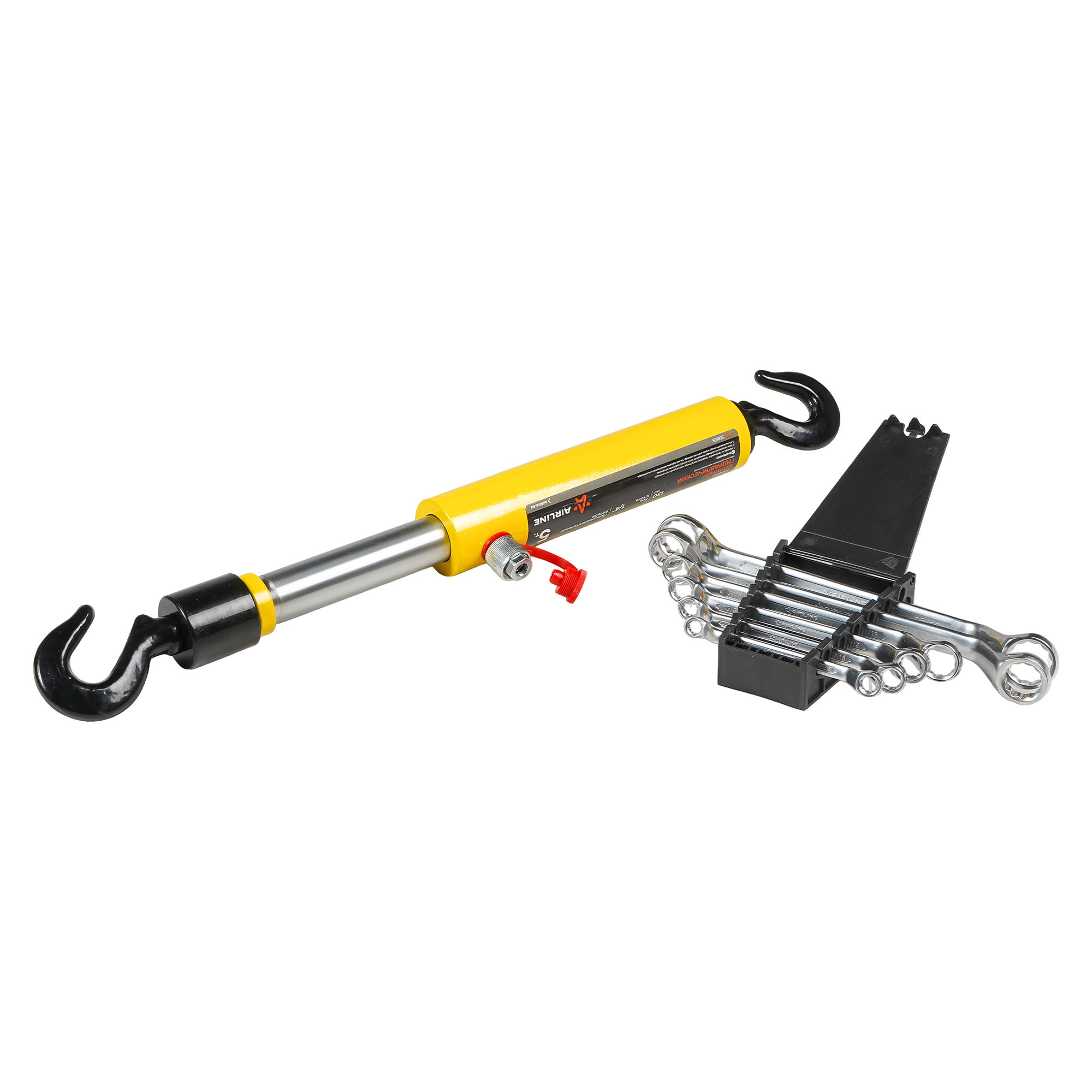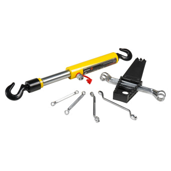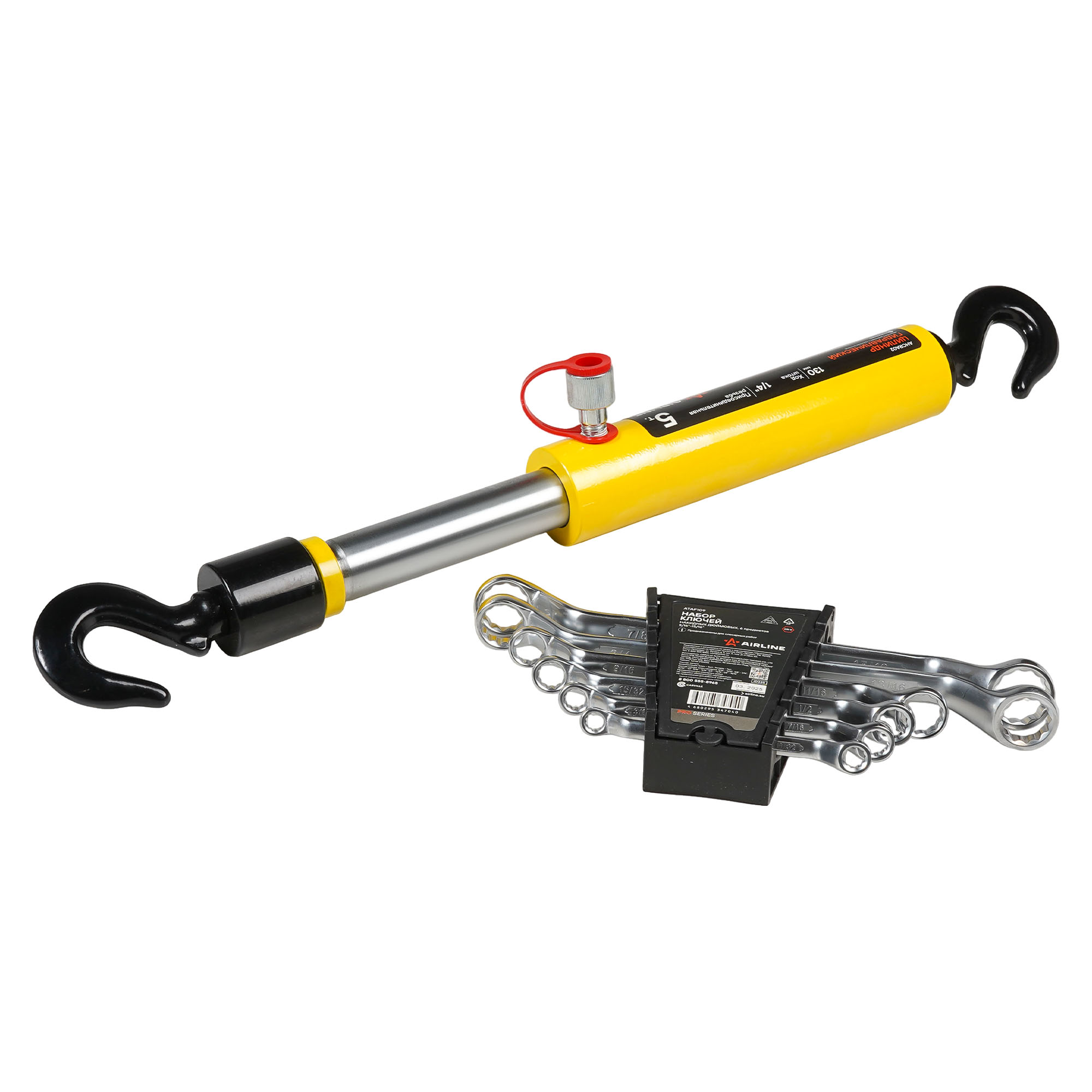 Гидравлическая стяжка 5т (обратного действия, с крюками) + Набор дюймовых накидных ключей PRO (6 пр., 5/16"–15/16"). Функциональный комплект для профессионального применения в автосервисах, мастерских, на СТО и в условиях ремонта тяжёлой техники. Объединяет в себе мощную гидравлическую стяжку и универсальный набор дюймовых накидных ключей для работы с крепежом по американским и британским стандартам.