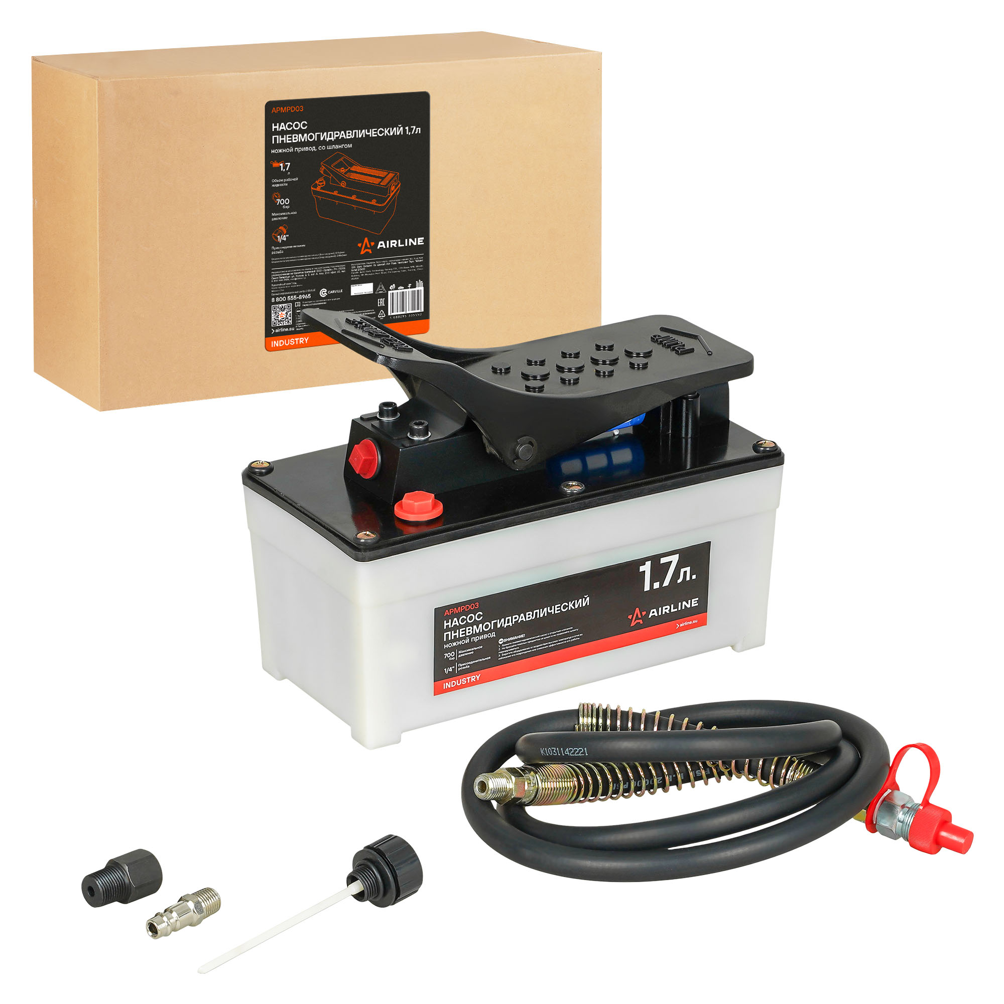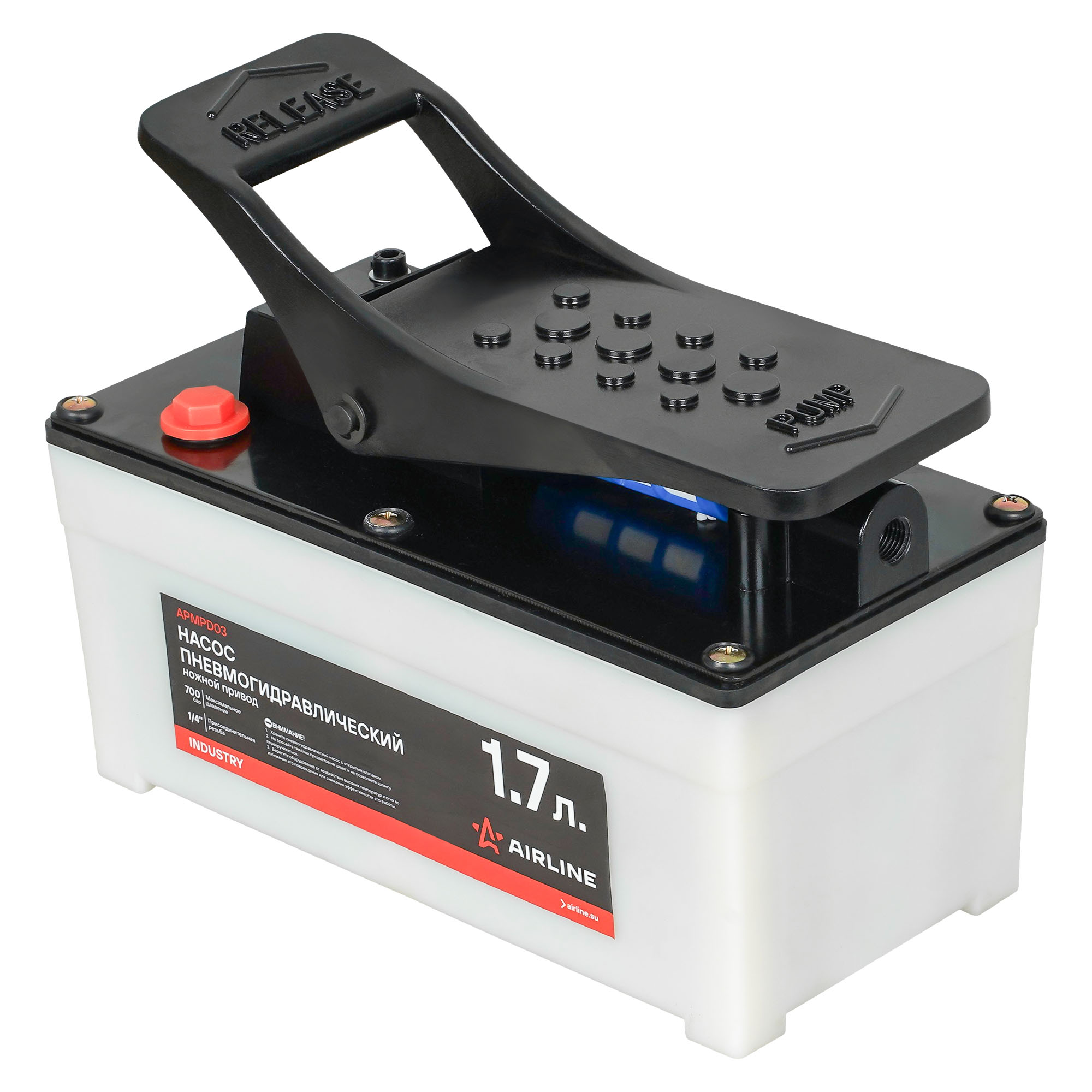 Пневмогидравлический насос APMPD03 является универсальным инструментом, который производит давление для различного гидравлического оборудования. Насос выполнен из высокопрочной стали и снабжен предохранительным клапаном, который предотвращает перегрузы. Объём рабочей жидкости составляет 1.7л. Длинна рукава высокого давления составляет 1.5 м и имеет диаметр 15 мм. В комплекте также идет быстроразъемное соединение с резьбой 3/8. Насос применим для работ с гидравлическими цилиндрами прямого и обратного действия в гидравлических гаражных прессах и кранах, стяжках пружин подвески автомобилей, наборах гидравлических растяжек для кузовного ремонта.