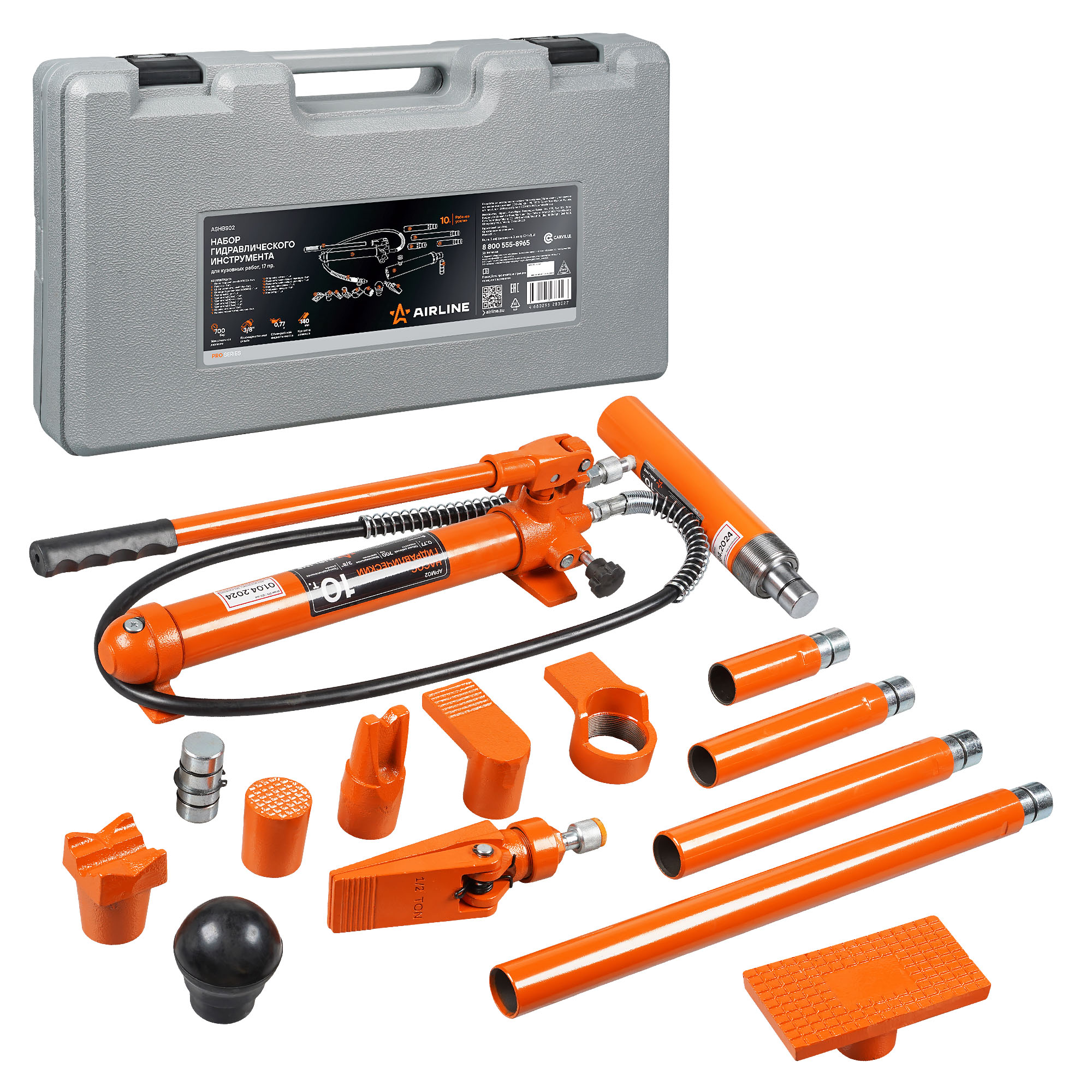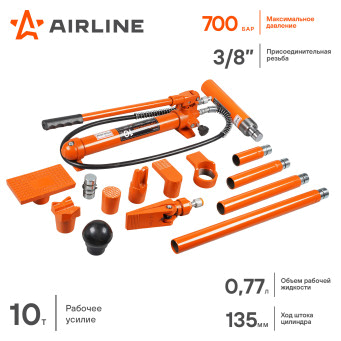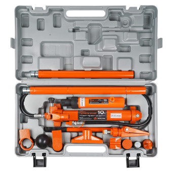 Набор гидравлического инструмента для кузовного ремонта AIRLINE ASHBS02 10 т, 17 предметов. Комплект предназначен для проведения рихтовочных и кузовных работ, таких как восстановления геометрии больших участков и целых конструкций, главным образом проемов дверей, окон, капота и багажника. В набор входит: гидравлический насос, цилиндр, удлинители и фигурные насадки. Все элементы выполнены из высокопрочной стали, которые отличаются надежностью и долговечностью.