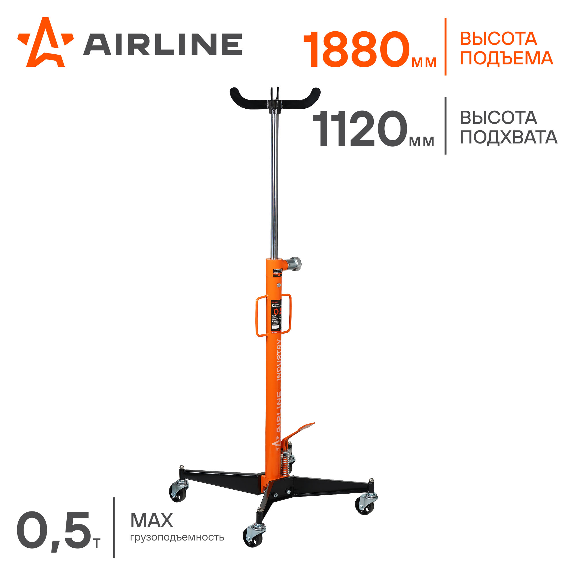 Стойка трансмиссионная AIRLINE 0.5т, MIN-1120 мм, MAX-1880 мм. Удерживающий механизм, используется на станциях технического обслуживания для монтажа и демонтажа агрегатов автомобилей при ремонте и техническом обслуживании. Надёжный и удобный в использовании гидравлический механизм, надежно регулирует и фиксирует грузы. Транспортировочные шасси и ручки способствуют удобному перемещению стойки по рабочей площадке.