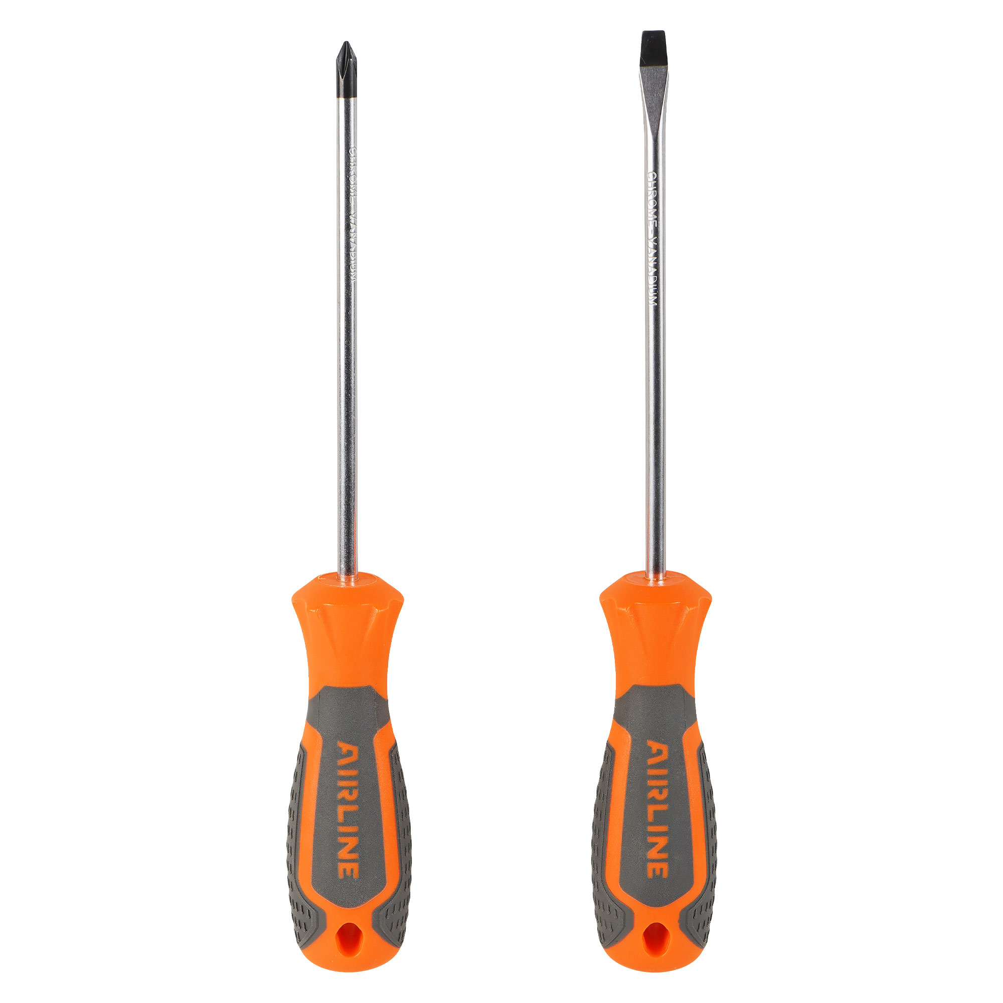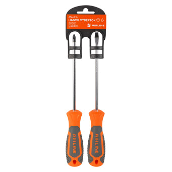 Сочетание твёрдых и мягких элементов рукоятки оптимально распределяет усилие, прилагаемое к инструменту, и предотвращает проскальзывание. Эргономичный дизайн облегчает работу. Отвёртки AIRLINE удобно подвешиваются за специальное отверстие. Лезвие отвёрток AIRLINE изготовлено из хром-ванадиевой стали, жало подвержено индукционной закалке и фосфатировано.