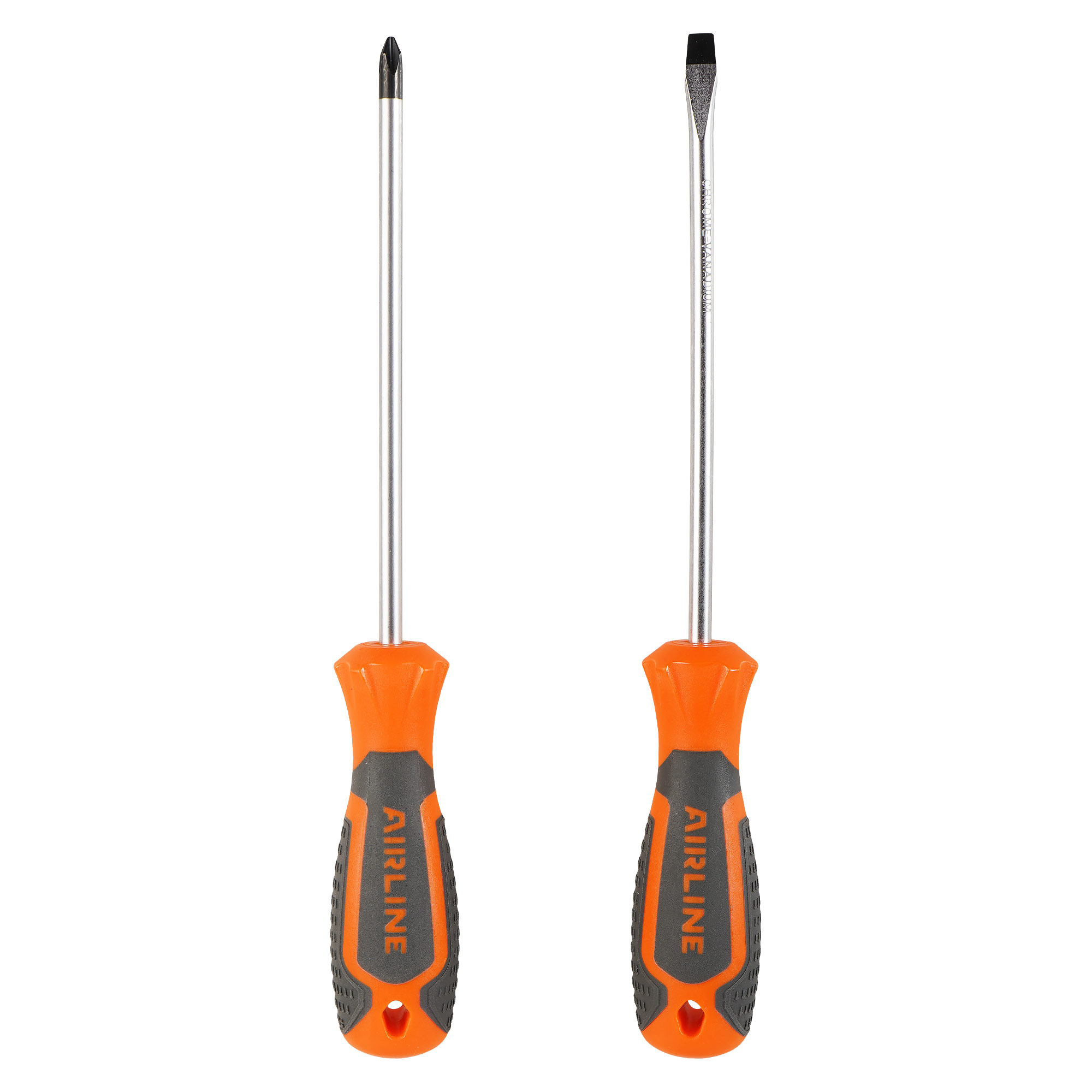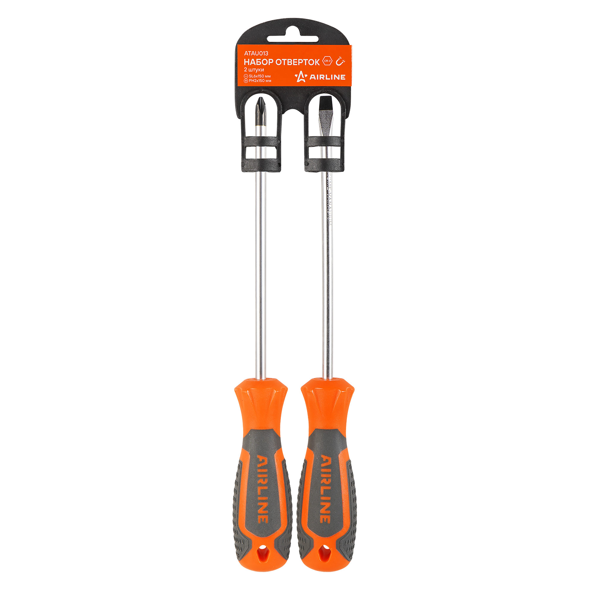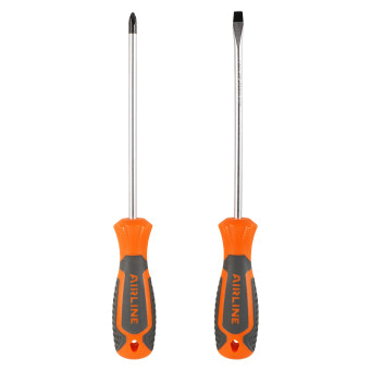 Сочетание твёрдых и мягких элементов рукоятки оптимально распределяет усилие, прилагаемое к инструменту, и предотвращает проскальзывание. Эргономичный дизайн облегчает работу. Отвёртки AIRLINE удобно подвешиваются за специальное отверстие. Лезвие отвёрток AIRLINE изготовлено из хром-ванадиевой стали, жало подвержено индукционной закалке и фосфатировано.
