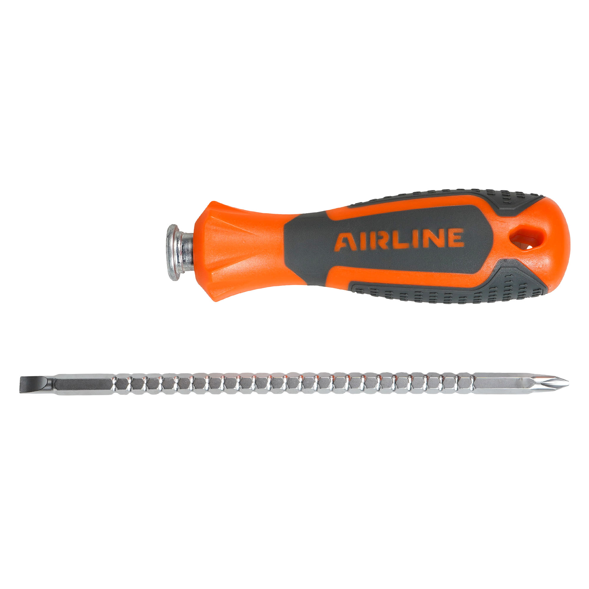 Сочетание твёрдых и мягких элементов рукоятки оптимально распределяет усилие, прилагаемое к инструменту, и предотвращает проскальзывание. Эргономичный дизайн облегчает работу. Отвёртки AIRLINE удобно подвешиваются за специальное отверстие. Лезвие отвёрток AIRLINE изготовлено из хром-ванадиевой стали, жало подвержено индукционной закалке и фосфатировано.