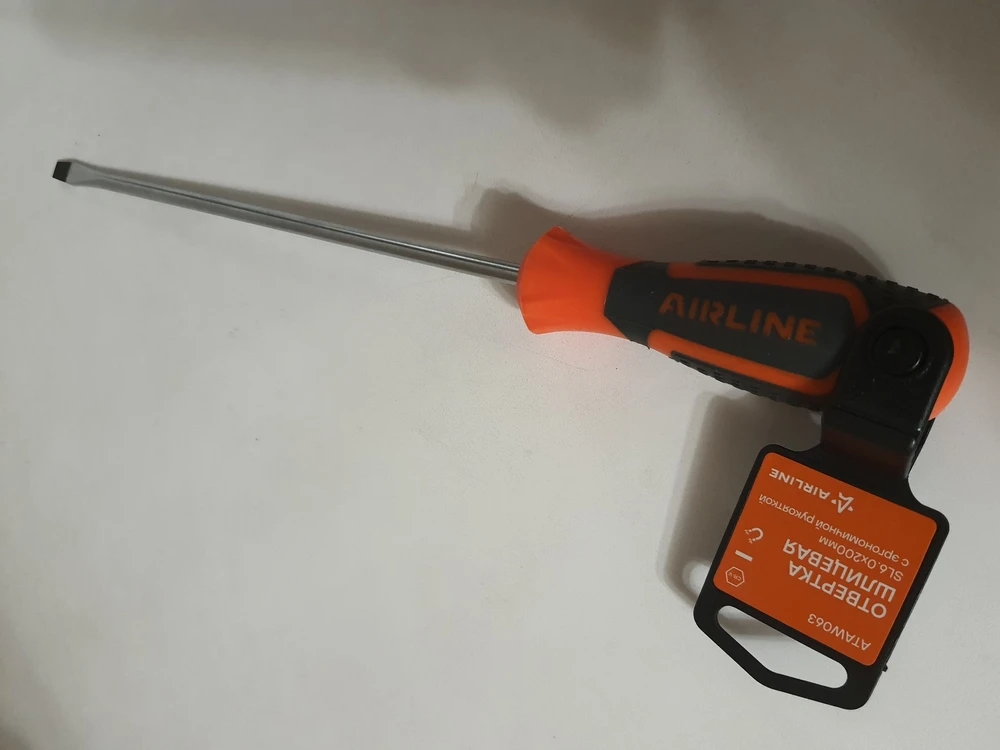 Сочетание твёрдых и мягких элементов рукоятки оптимально распределяет усилие, прилагаемое к инструменту, и предотвращает проскальзывание. Эргономичный дизайн облегчает работу. Отвёртки AIRLINE удобно подвешиваются за специальное отверстие. Лезвие отвёрток AIRLINE изготовлено из хром-ванадиевой стали, жало подвержено индукционной закалке и фосфатировано.