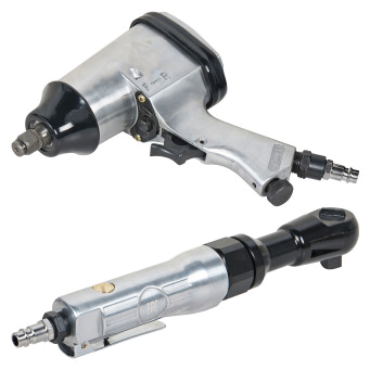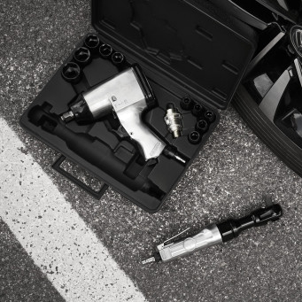 Пневматический ударный гайковерт применяется для механизации слесарно-монтажных работ для затяжки (закручивания) или ослабления (откручивания) особо нагруженных и осложненных резьбовых соединений с высокой скоростью, мощностью, дифференцированным крутящим моментом и низкими затратами энергии и физических сил оператора. Пневматическая трещотка предназначена для быстрого закручивания/откручивания болтов, винтов и гаек, не применяя больших трудозатрат оператора. Рукоятка инструмента имеет нескользящую ребристую поверхность - для удобного удержания инструмента при работе.