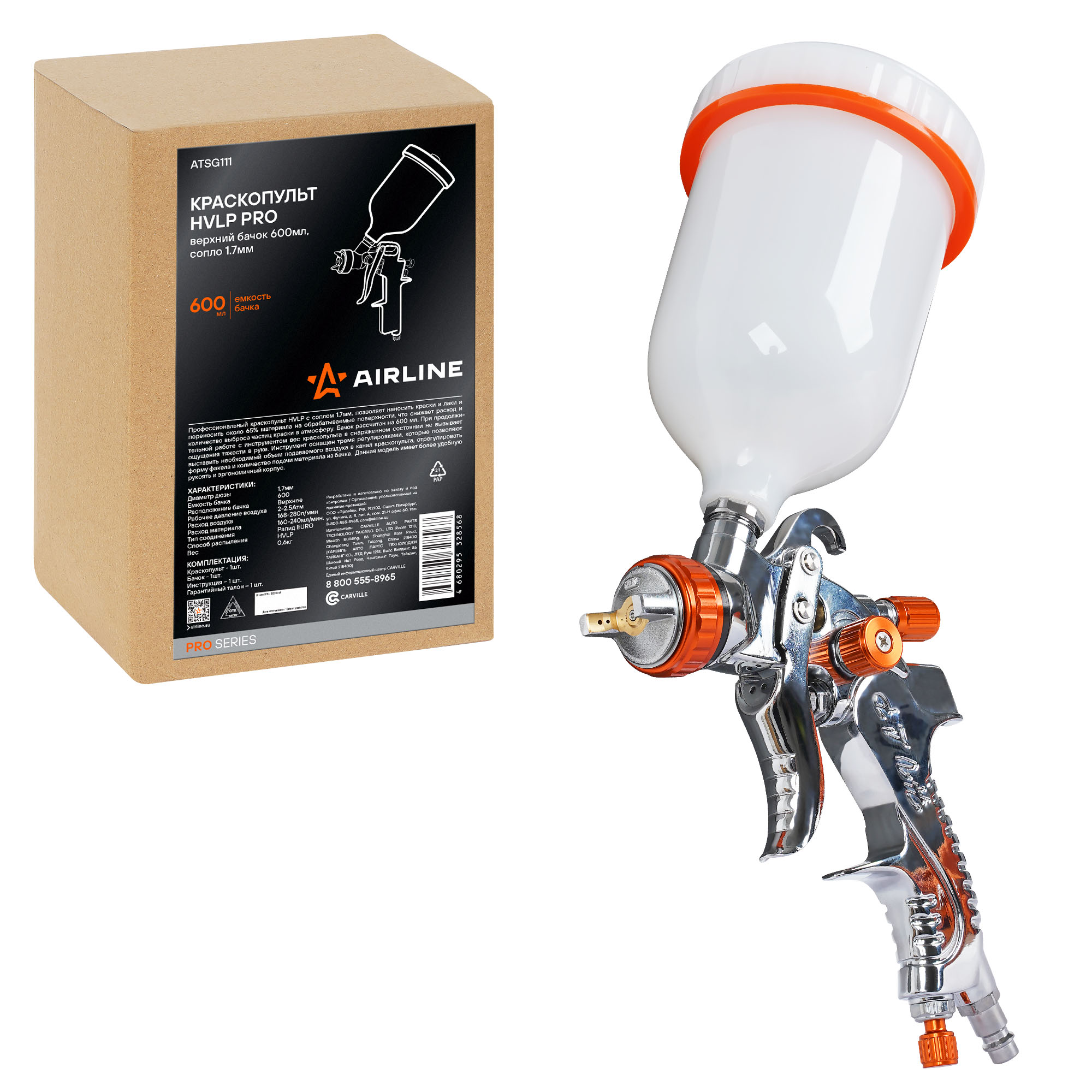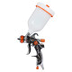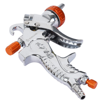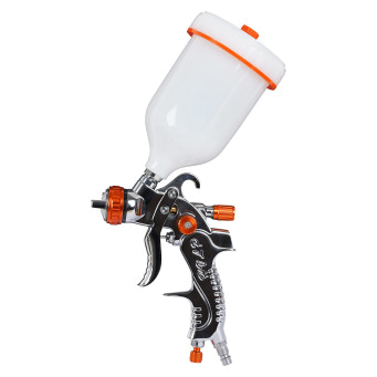 Профессиональный краскопульт HVLP с соплом 1.7 мм. позволяет наносить краски и лаки и переносить около 65% материала на обрабатываемые поверхности, что снижает расход и количество выброса частиц краски в атмосферу. Бачок рассчитан на 600 мл. При продолжительной работе с инструментом вес краскопульта в снаряженном состоянии не вызывает ощущения тяжести в руке. Инструмент оснащен тремя регулировками, которые позволяют выставить необходимый объем подаваемого воздуха в канал краскопульта, отрегулировать форму факела и количество подачи материала из бачка. Данная модель имеет более удобную рукоять и эргономичный корпус.