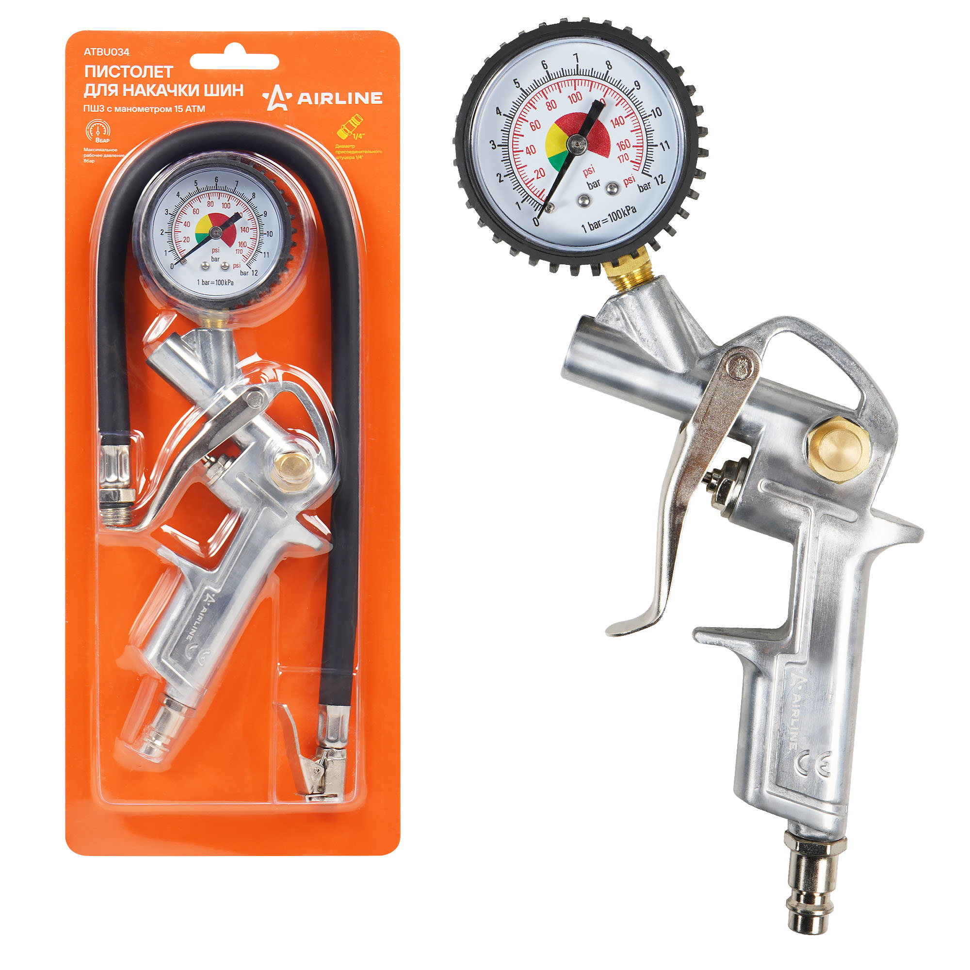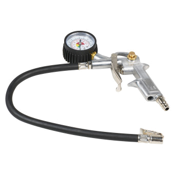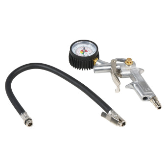 Корпус пистолета изготовлен из алюминиевого сплава. Манометр защищён резиновым чехлом. Гибкий шланг имеет быстросъёмный наконечник. Конструкцией предусмотрена кнопка для сброса лишнего давления. В комплект входит присоединительный фитинг 1/4".