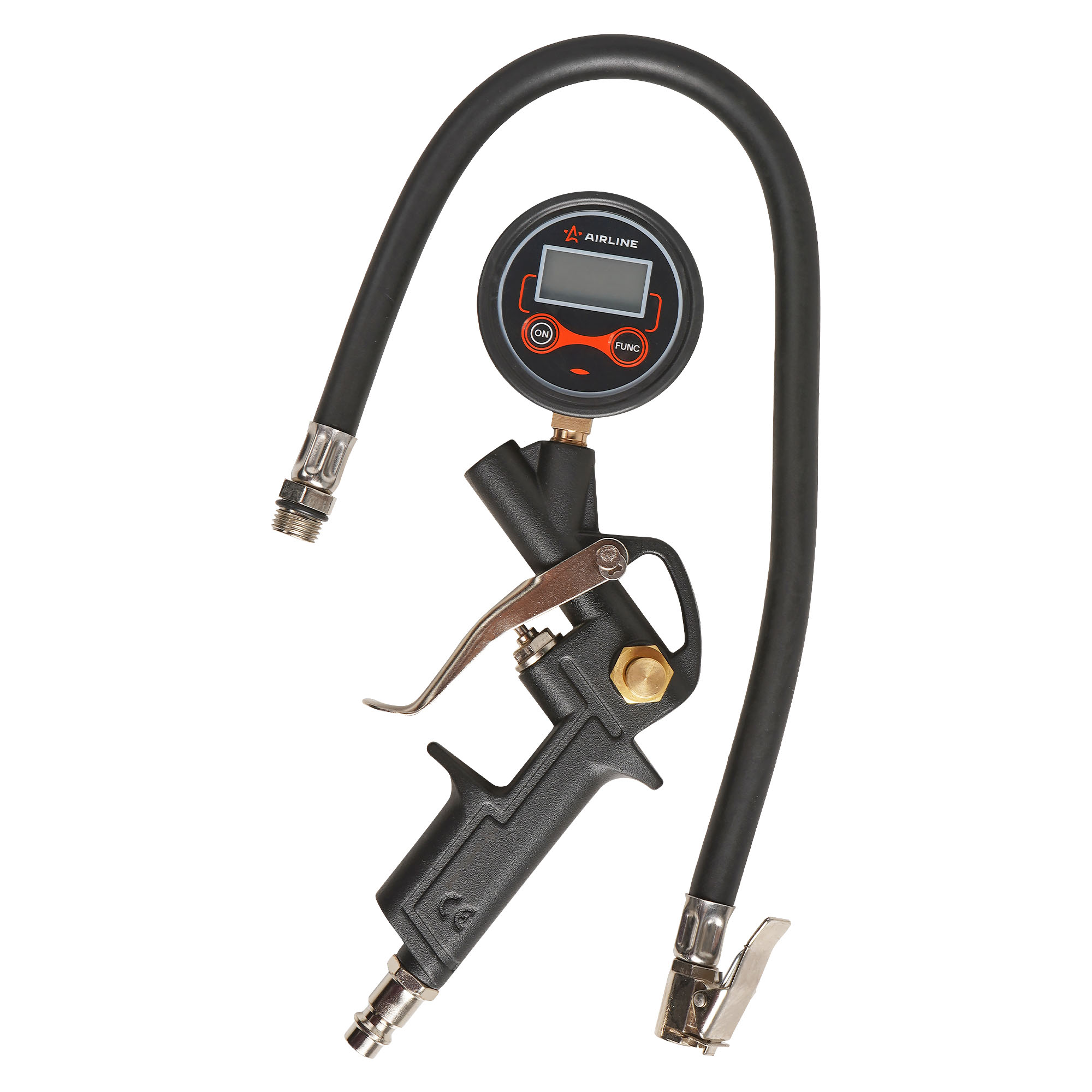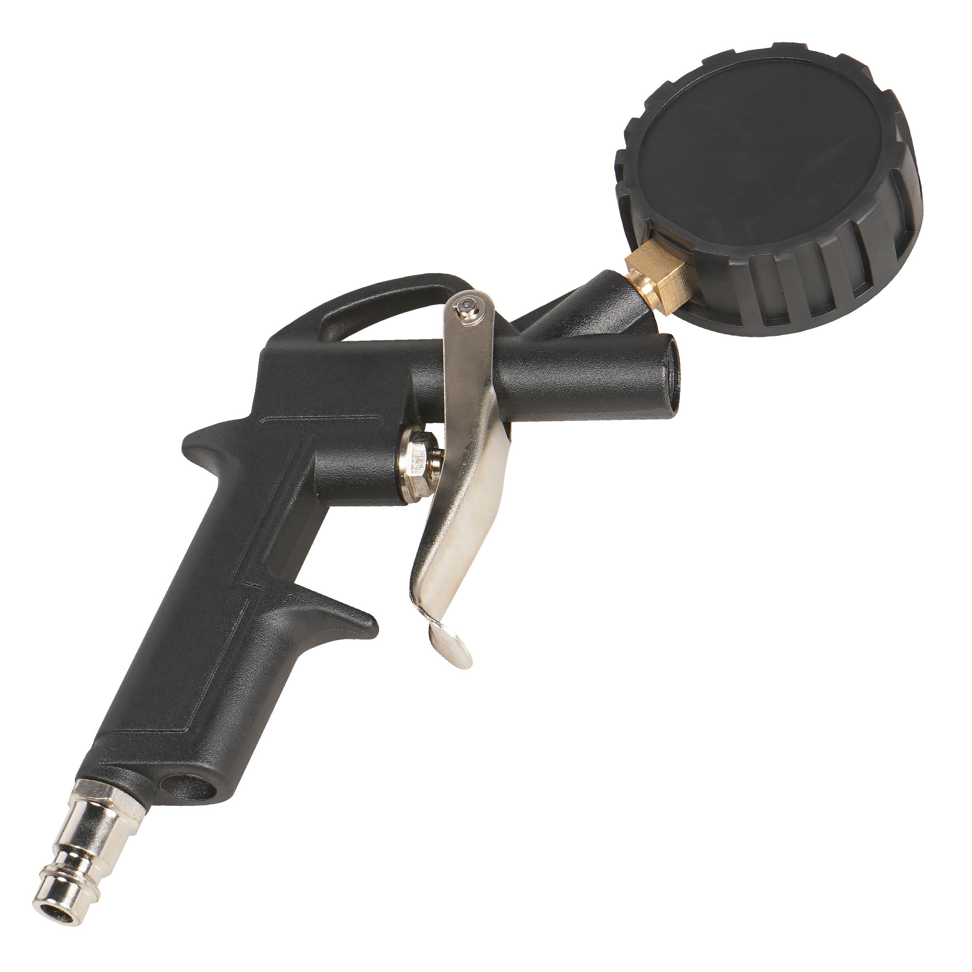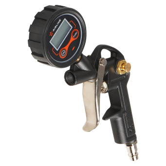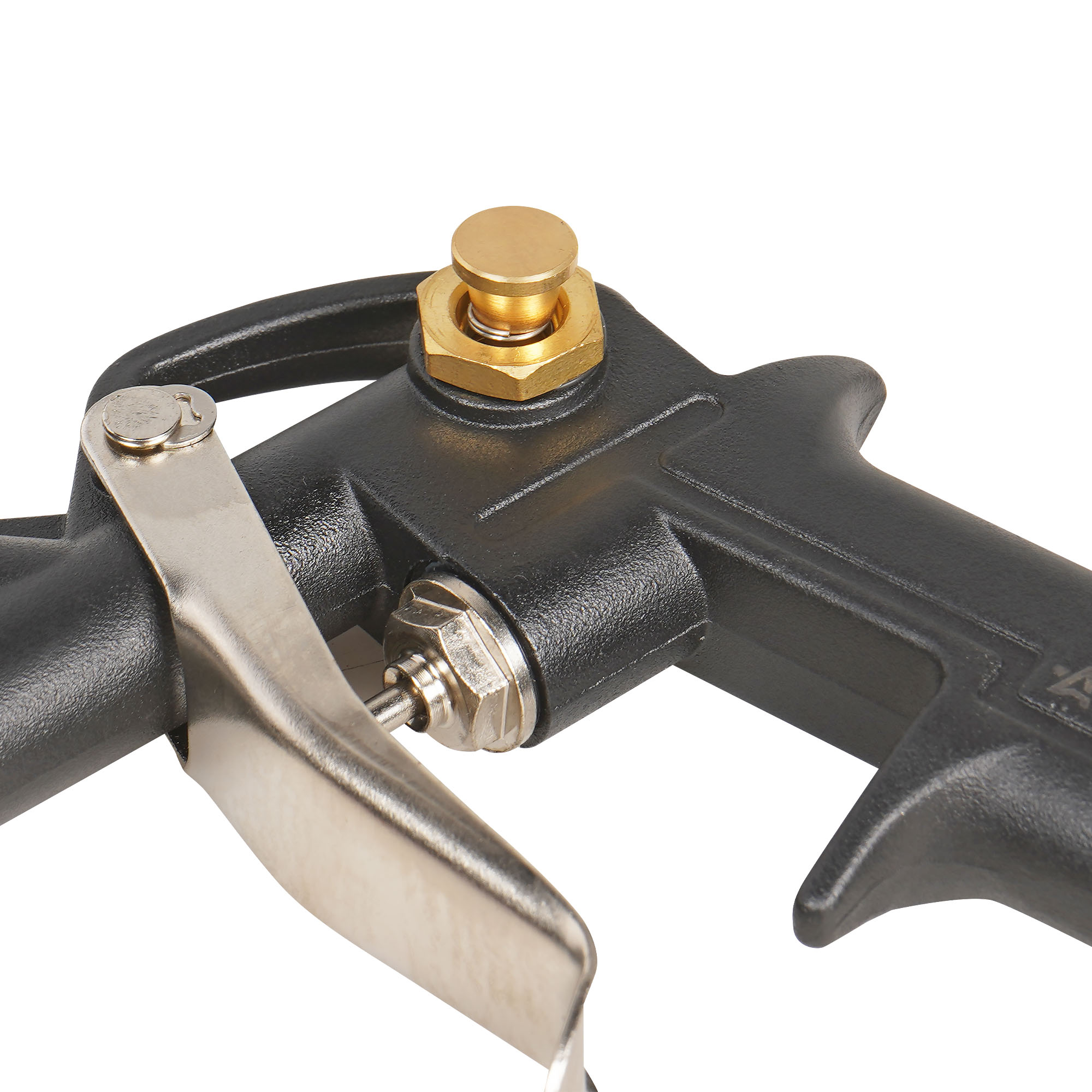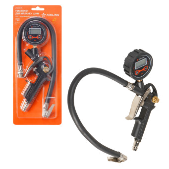 Корпус пистолета изготовлен из алюминиевого сплава. Манометр защищён резиновым чехлом. Гибкий шланг имеет быстросъёмный наконечник. Конструкцией предусмотрена кнопка для сброса лишнего давления. В комплект входит присоединительный фитинг 1/4".