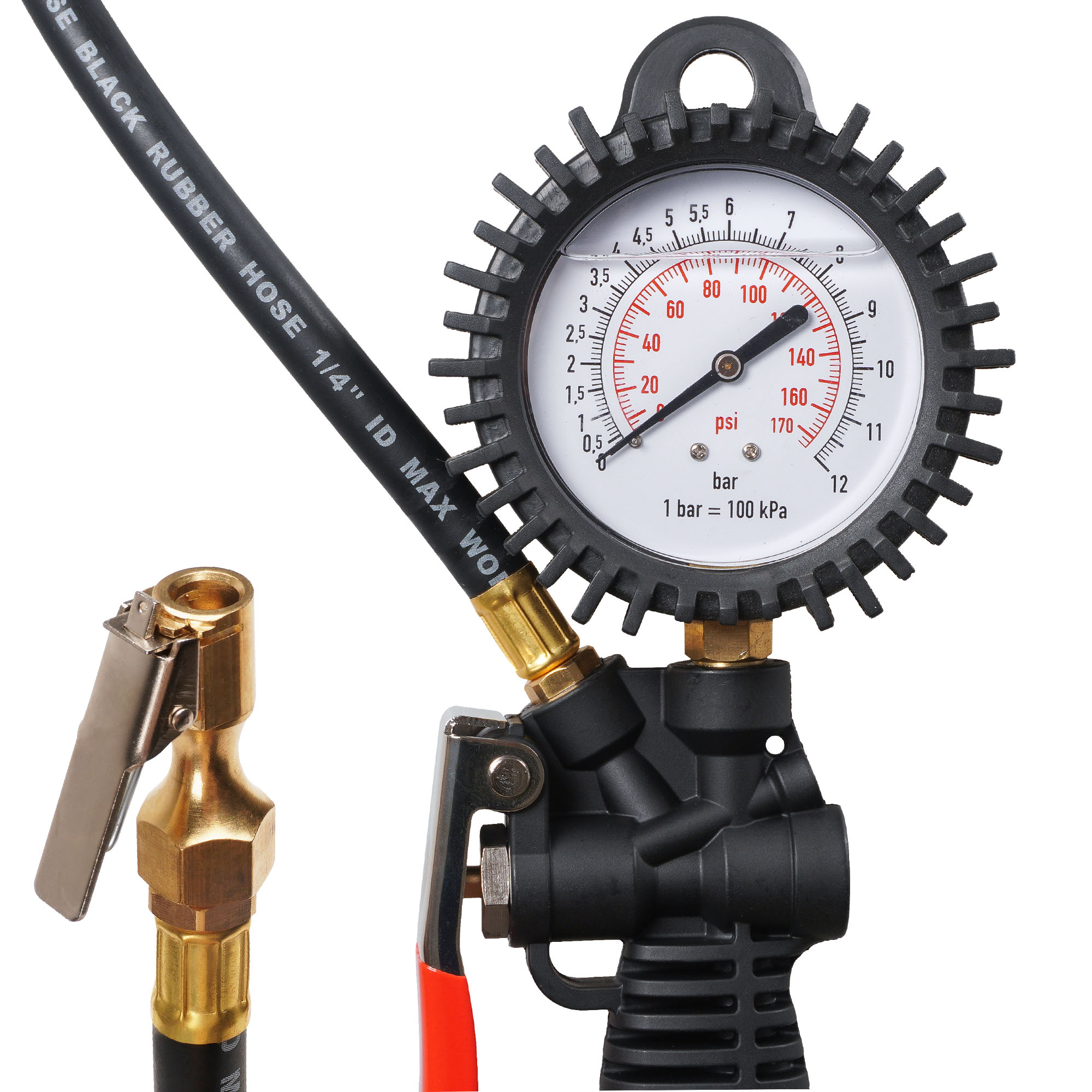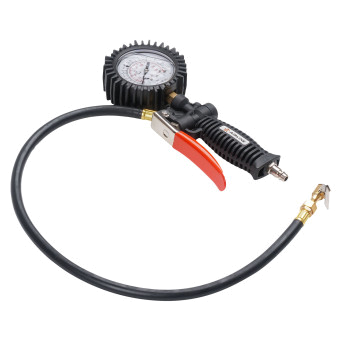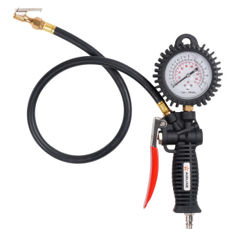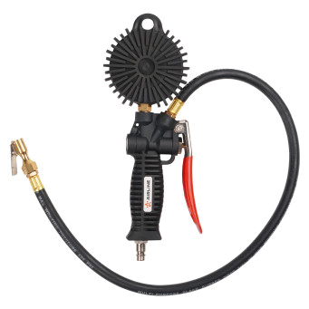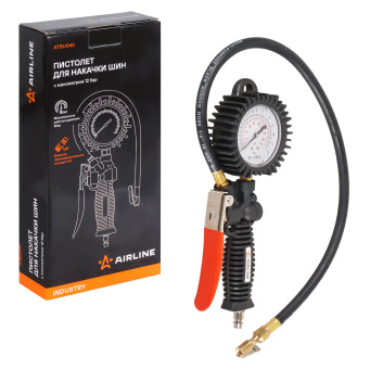 Корпус пистолета изготовлен из нейлона. Манометр защищён резиновым чехлом. Гибкий шланг имеет быстросъёмный наконечник. Конструкцией предусмотрена функция для сброса лишнего давления. В комплект входит присоединительный фитинг 1/4".
