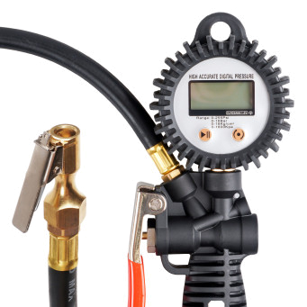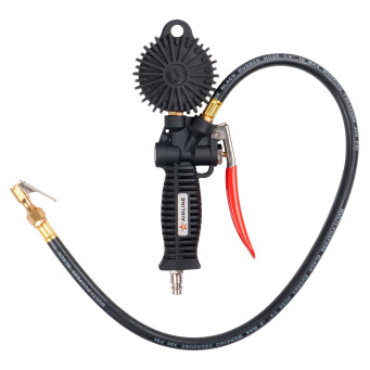 Корпус пистолета изготовлен из нейлона. Манометр защищён резиновым чехлом. Гибкий шланг имеет быстросъёмный наконечник. Конструкцией предусмотрена функция для сброса лишнего давления. В комплект входит присоединительный фитинг 1/4".