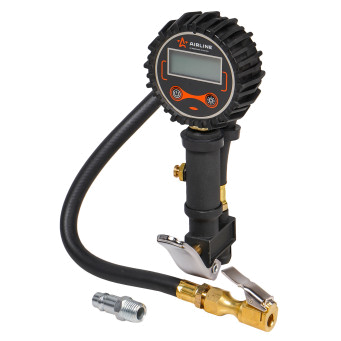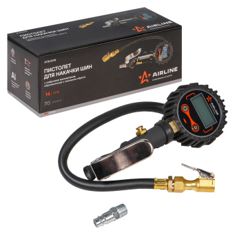Корпус пистолета изготовлен из алюминиевого сплава. Электронный манометр защищён резиновым чехлом. Гибкий шланг имеет быстросъёмный наконечник. Конструкцией предусмотрена кнопка для сброса лишнего давления. В комплект входит присоединительный фиттинг 1/4".