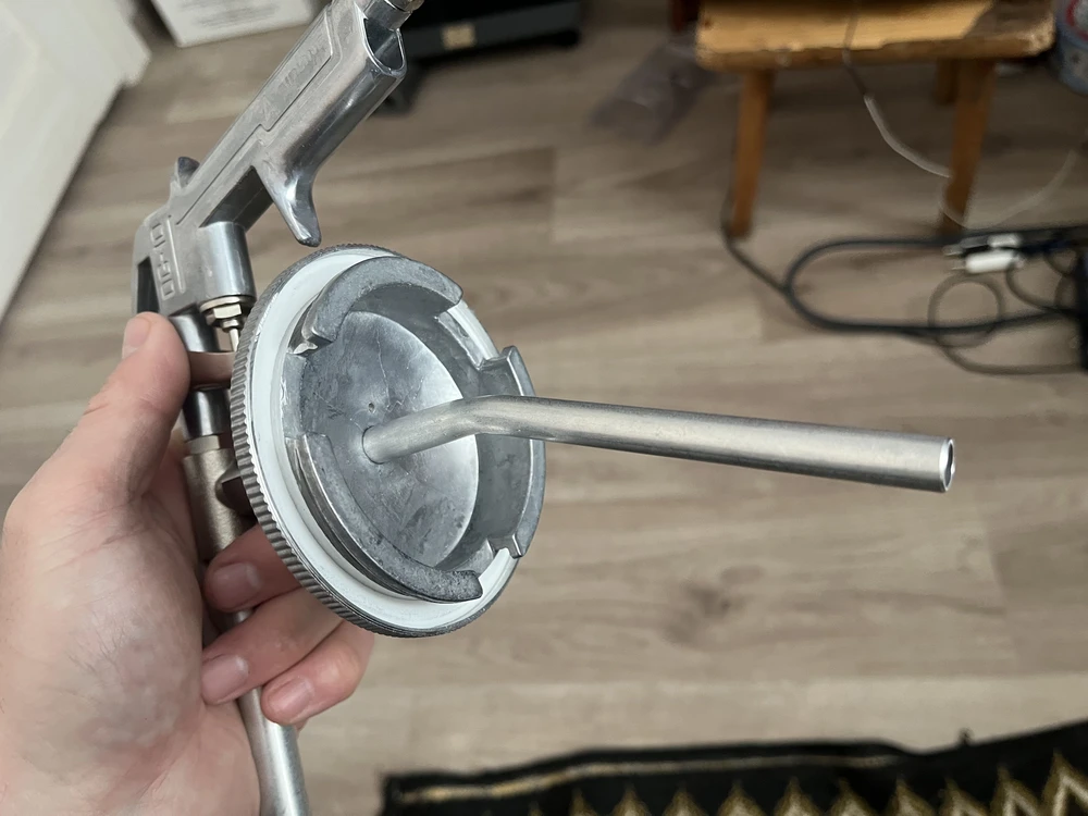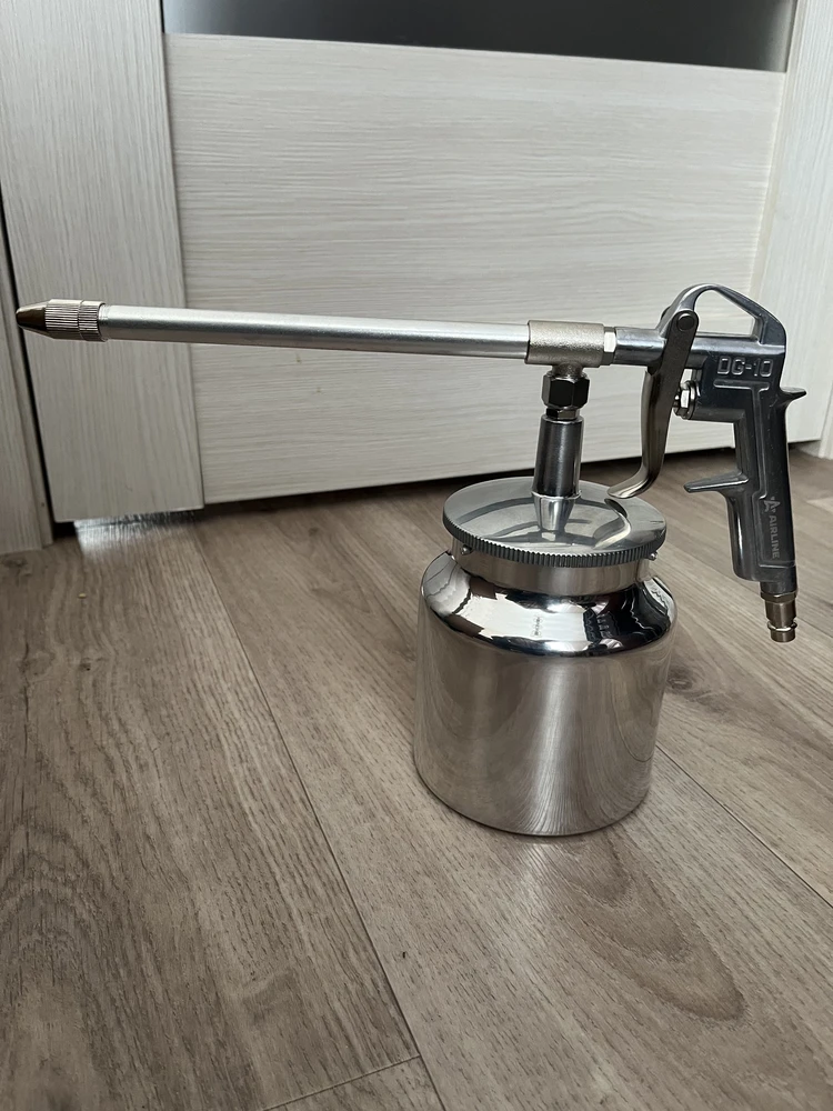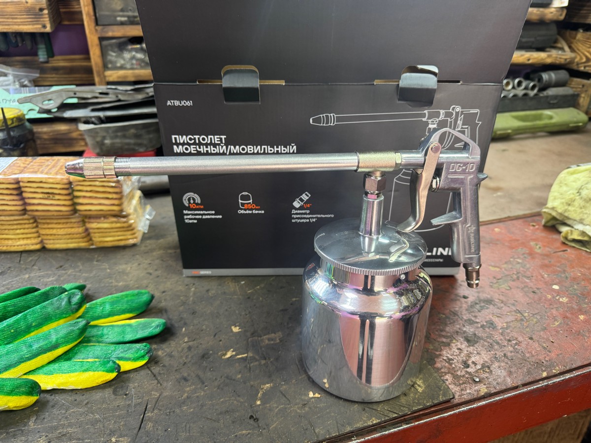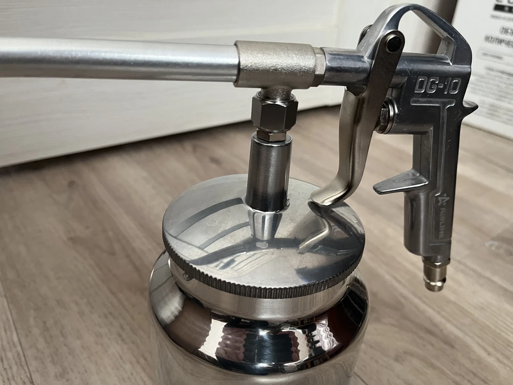 Пистолет изготовлен из металла. Имеет быстросъёмный бачок для распыляемого состава с байонетным присоединением.