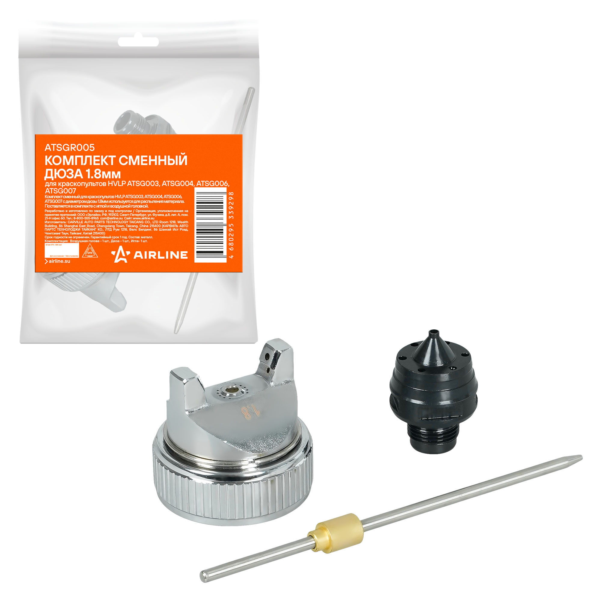 Комплект сменный для краскопультов HVLP ATSG003, ATSG004, ATSG006, ATSG007 с диаметром дюзы 1.8мм используется для распыления материала. Поставляется в комплекте с иглой и воздушной головкой.