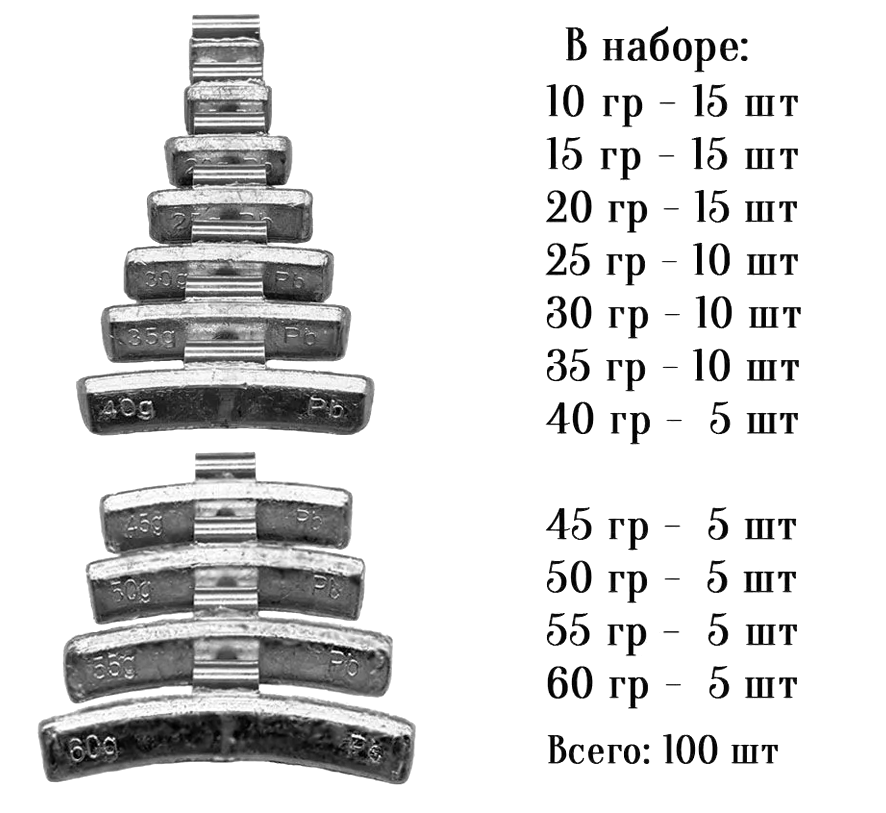 Грузы балансиров. набивные для литых дисков набор 100шт (10,15,20,25,30,35,40,45,50,55,60г)