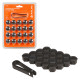 Колпачки на колесные болты или гайки, которые упакованы в наборы по 20 шт. со специальным съемником для облегчения демонтажа. Изготовлены из ударопрочного пластика серого цвета и имеют три типа размера-17,19,21 мм. Колпачки устанавливаются сверху колесных болтов/гаек и служат для защиты колесного крепежа от внешнего воздействия агрессивной среды, сокрытия дефектов, а также являются отличным дополнением к внешнему тюнингу автомобиля.
