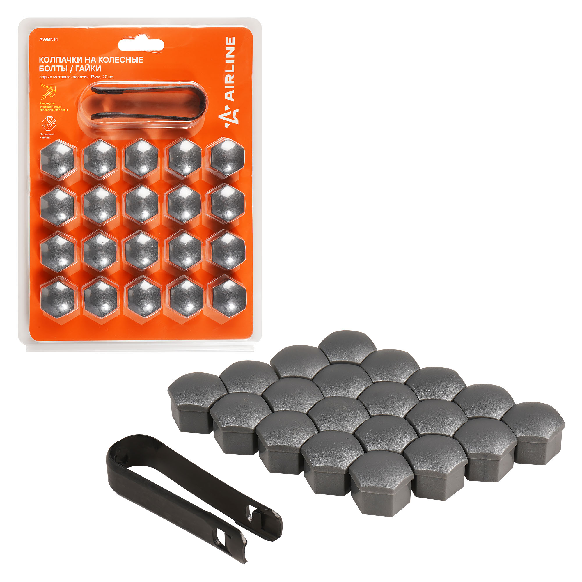 Колпачки на колесные болты или гайки, которые упакованы в наборы по 20 шт. со специальным съемником для облегчения демонтажа. Изготовлены из ударопрочного пластика серого цвета и имеют три типа размера-17,19,21 мм. Колпачки устанавливаются сверху колесных болтов/гаек и служат для защиты колесного крепежа от внешнего воздействия агрессивной среды, сокрытия дефектов, а также являются отличным дополнением к внешнему тюнингу автомобиля.