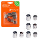 Колпачки предназначены для защиты шинного вентиля от попадания загрязнений и жидкости. Колпачки помогают создать герметичность внутри шины автомобиля, создавая барьер для травления воздуха. Данный набор колпачков имеет металические втулки- манжеты для защиты шинного вентиля от повреждений. Колпачки имеют металлический корпус и расцветку «хром».
