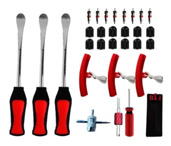 Комплект предназначен для самостоятельной замены мотошин и велосипедных шин, а также для обслуживания ниппелей и клапанов. Набор сочетает инструменты для монтажа покрышек и элементы для полноценного ухода за колёсами.В комплект входят 3 прочные монтажные лопатки, обеспечивающие удобное снятие и установку шины. Оптимальная длина инструмента создаёт хороший рычаг, облегчая работу даже с жёстким бортом.Для защиты диска предусмотрены 2 силиконовые накладки, которые предотвращают появление царапин и сколов при замене резины.Дополнительно набор укомплектован инструментами для обслуживания ниппеля:короткий экстрактор золотников,двусторонний экстрактор,метчик 4-в-1 для очистки и восстановления резьбы,10 пластиковых колпачков,10 запасных золотников.Расширенная комплектация позволяет не только заменить покрышку, но и при необходимости обслужить или заменить детали вентиля.Комплект подходит для мотоциклов, скутеров, питбайков и большинства велосипедов. Практичное решение для гаража, мастерской или выездного ремонта — всё необходимое для аккуратной замены шин и обслуживания колёс в одном наборе.