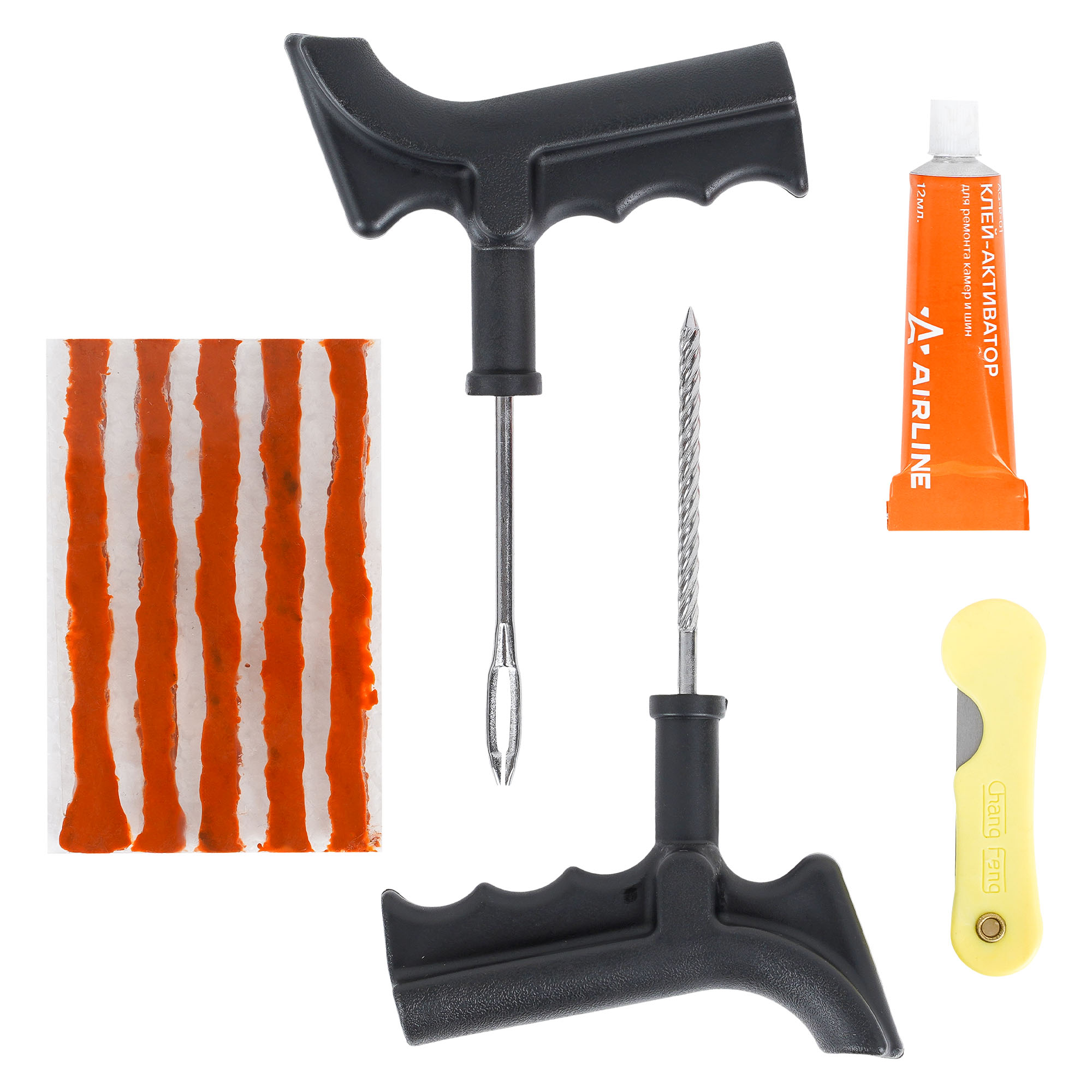 Ремонтный комплект поможет произвести экстренный ремонт шин. В наборе представлены инструменты шило спиральное с насечками и шило для установки жгута с игольчатым наконечником, а также 5 штук армированных жгутов из сырой резины длиной 10 см. Набор является бюджетным вариантом оказания ремонтных услуг с базовым комплектом необходимых инструментов. С помощью инструмента шило спиральное с насечками зачищается место прокола. С помощью инструмента с игольчатым отверстием прокол заделывается жгутом из сырой резины, на который предварительно наносится клей активатор. Пару минут ожидания и можно ехать!