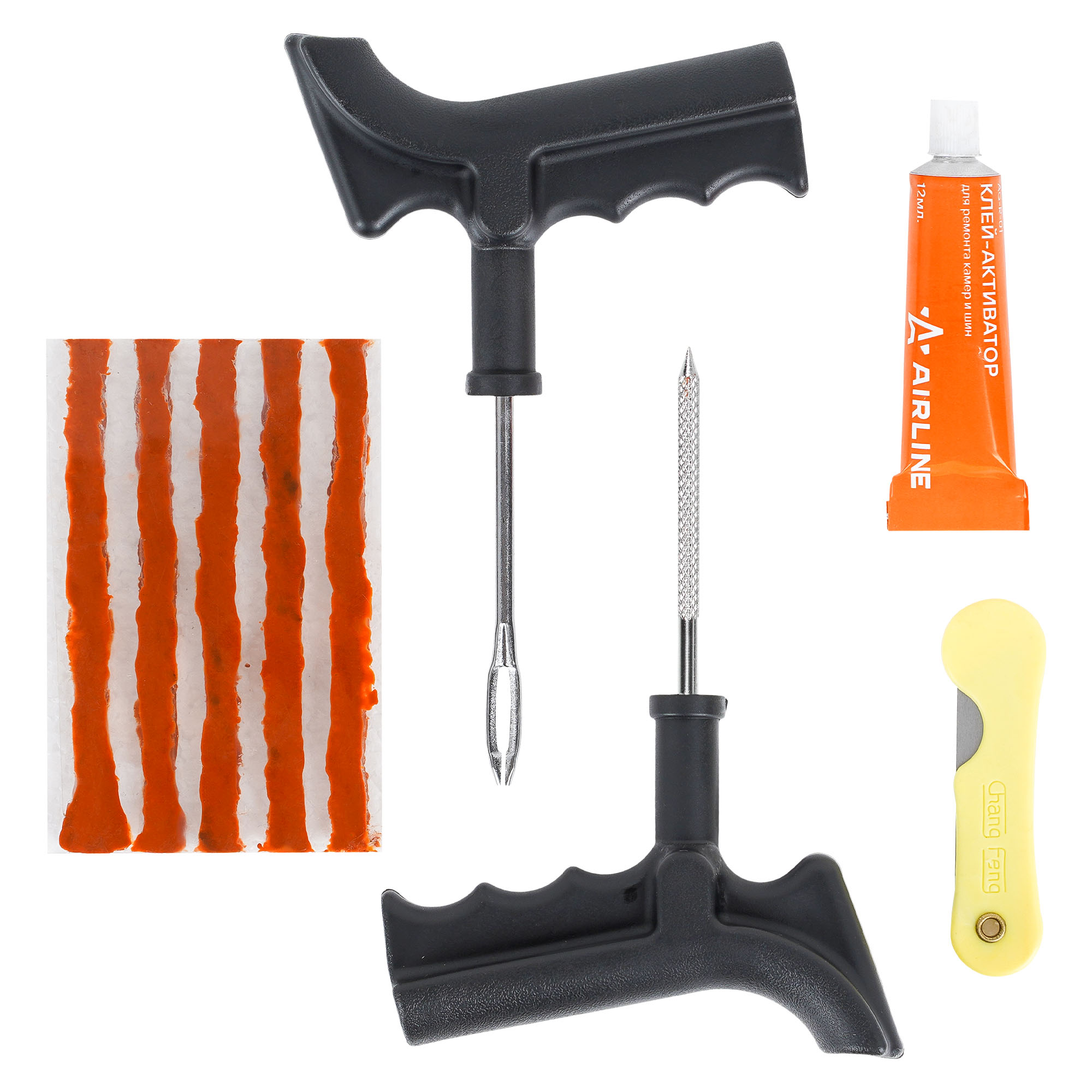Ремонтный комплект поможет произвести экстренный ремонт шин. В наборе представлены инструменты шило-напильник и шило для установик жгута с игольчатым наконечником, а также 5 штук армированных жгутов сырой резины длиной 10 см. Набор является бюджетным вариантом оказания ремонтных услуг с базовым комплектом необходимых инструментов. С помощью инструмента шило-напильник зачищается место прокола. С помощью инструмента с игольчатым отверстием прокол заделывается жгутом из сырой резины. Пару минут ожидания и можно ехать!