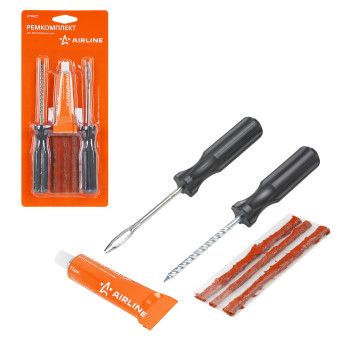 Ремонтный комплект поможет произвести экстренный ремонт шин. В наборе представлены инструменты шило со спиральным наконечником и шило для установик жгута с игольчатым наконечником, клей, а также 3 армированных жгута из сырой резины длиной 10 см. Набор является бюджетным вариантом оказания ремонтных услуг с базовым комплектом необходимых инструментов. С помощью инструмента c витым наконечником зачищается место прокола. С помощью инструмента с игольчатым отверстием прокол заделывается жгутом из сырой резины, на который предварительно наносится клей активатор. Пару минут ожидания и можно ехать!
