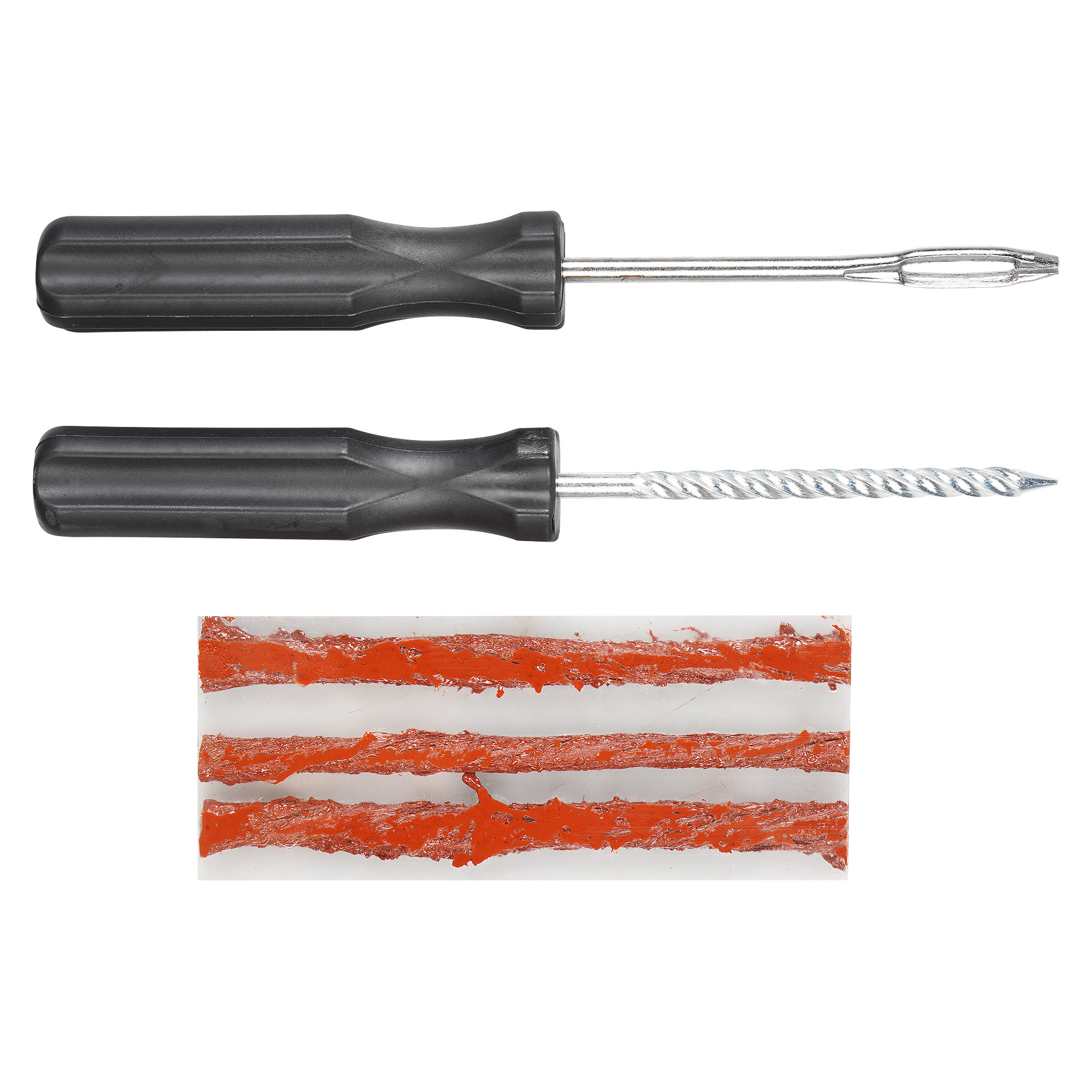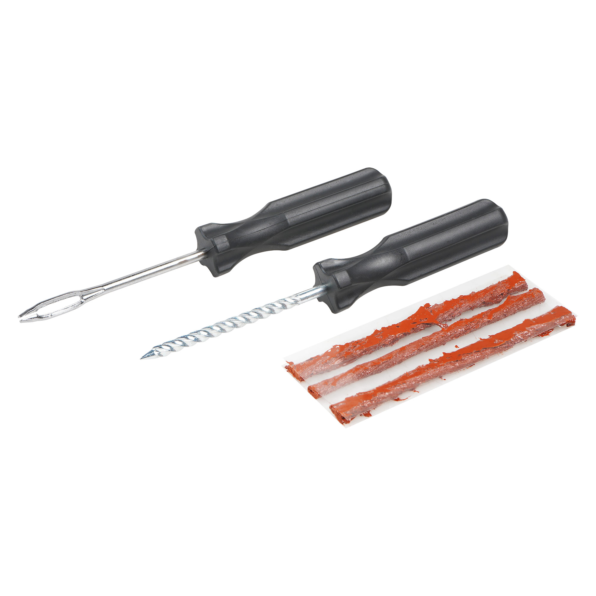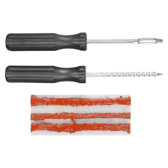 Ремонтный комплект поможет произвести экстренный ремонт шин. В наборе представлены инструменты шило спиральное с насечками и шило для установик жгута с игольчатым наконечником, а также 3 армированных жгута из сырой резины длиной 10 см. Набор является бюджетным вариантом оказания ремонтных услуг с базовым комплектом необходимых инструментов. С помощью инструмента шило спиральное с насечками зачищается место прокола. С помощью инструмента с игольчатым отверстием прокол заделывается жгутом из сырой резины. Пару минут ожидания и можно ехать!
