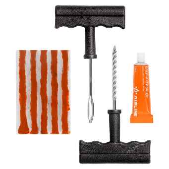 Ремонтный комплект поможет произвести экстренный ремонт шин. В наборе представлены инструменты шило спиральное с насечками и шило для установки жгута с игольчатым наконечником, а также 5 армированных жгутов из сырой резины длиной 10 см. Набор является бюджетным вариантом оказания ремонтных услуг с базовым комплектом необходимых инструментов. С помощью инструмента шило спиральное с насечками зачищается место прокола. С помощью инструмента с игольчатым отверстием прокол заделывается жгутом из сырой резины. Пару минут ожидания и можно ехать!