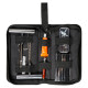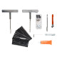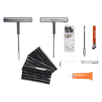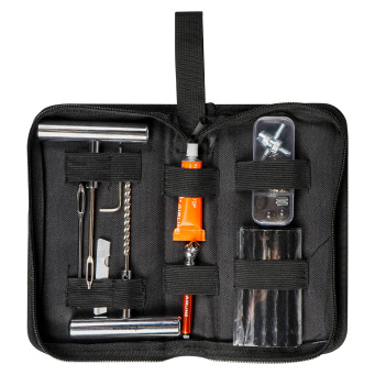 Ремонтный комплект поможет произвести экстренный ремонт шин. В наборе представлены инструменты с витым и с игольчатым наконечником, а также 20 штук бутилкаучуковых жгутов длиной 10 см. Для хранения инструментов предусмотрен удобный текстильный кейс на молнии. С помощью инструмента cо спиральным наконенчником зачищается место прокола. С помощью инструмента с игольчатым отверстием прокол заделывается жгутом из сырой резины.