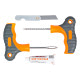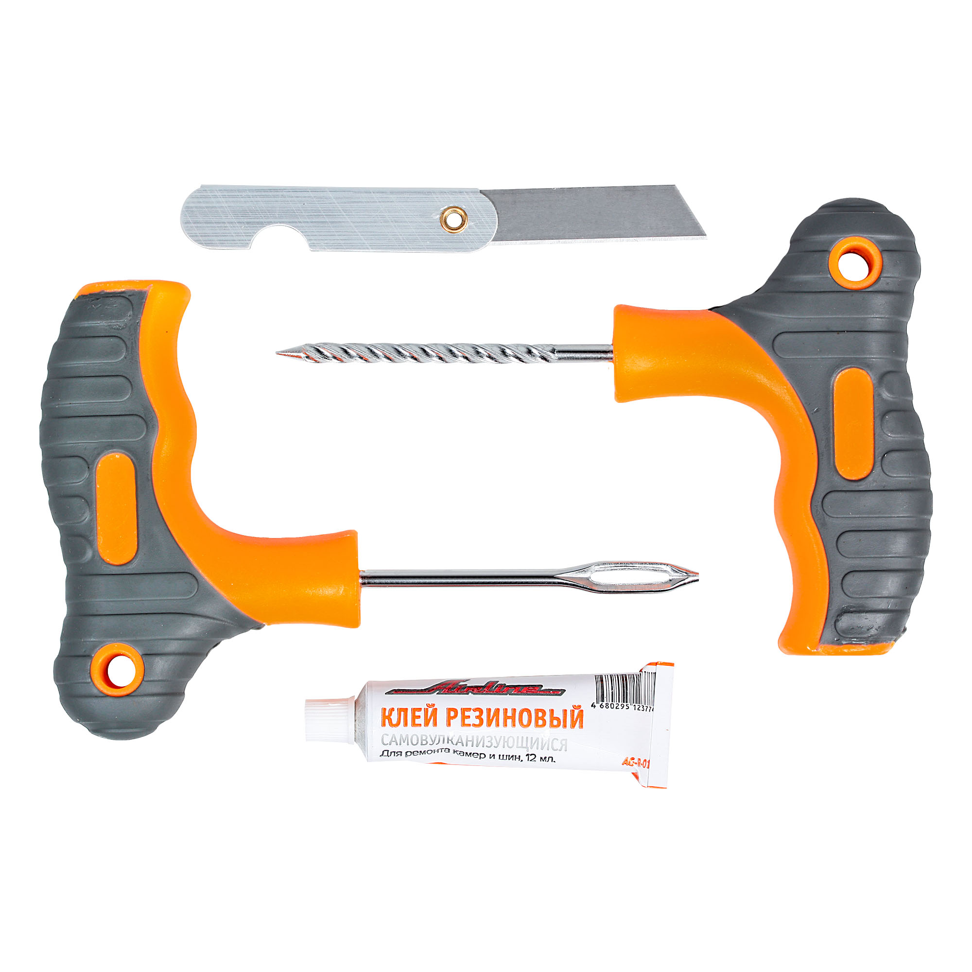 Ремонтный комплект поможет произвести экстренный ремонт шин. В наборе представлены инструменты с витым и с игольчатым наконечником, а также 10 штук жгутов сырой резины длиной 10 см. Набор является бюджетным вариантом оказания ремонтных услуг с базовым комплектом необходимых инструментов. С помощью инструмента c наконечником напильником зачищается место прокола. С помощью инструмента с игольчатым отверстием прокол заделывается жгутом из сырой резины, на который предварительно наносится клей активатор. Пару минут ожидания и можно ехать!