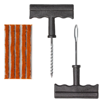 Ремонтный комплект поможет произвести экстренный ремонт шин. В наборе представлены инструменты с витым и с игольчатым наконечником, а также 5 штук жгутов сырой резины длиной 10 см. Набор является бюджетным вариантом оказания ремонтных услуг с базовым комплектом необходимых инструментов. С помощью инструмента c витым наконечником зачищается место прокола. С помощью инструмента с игольчатым отверстием прокол заделывается жгутом из сырой резины. Пару минут ожидания и можно ехать!