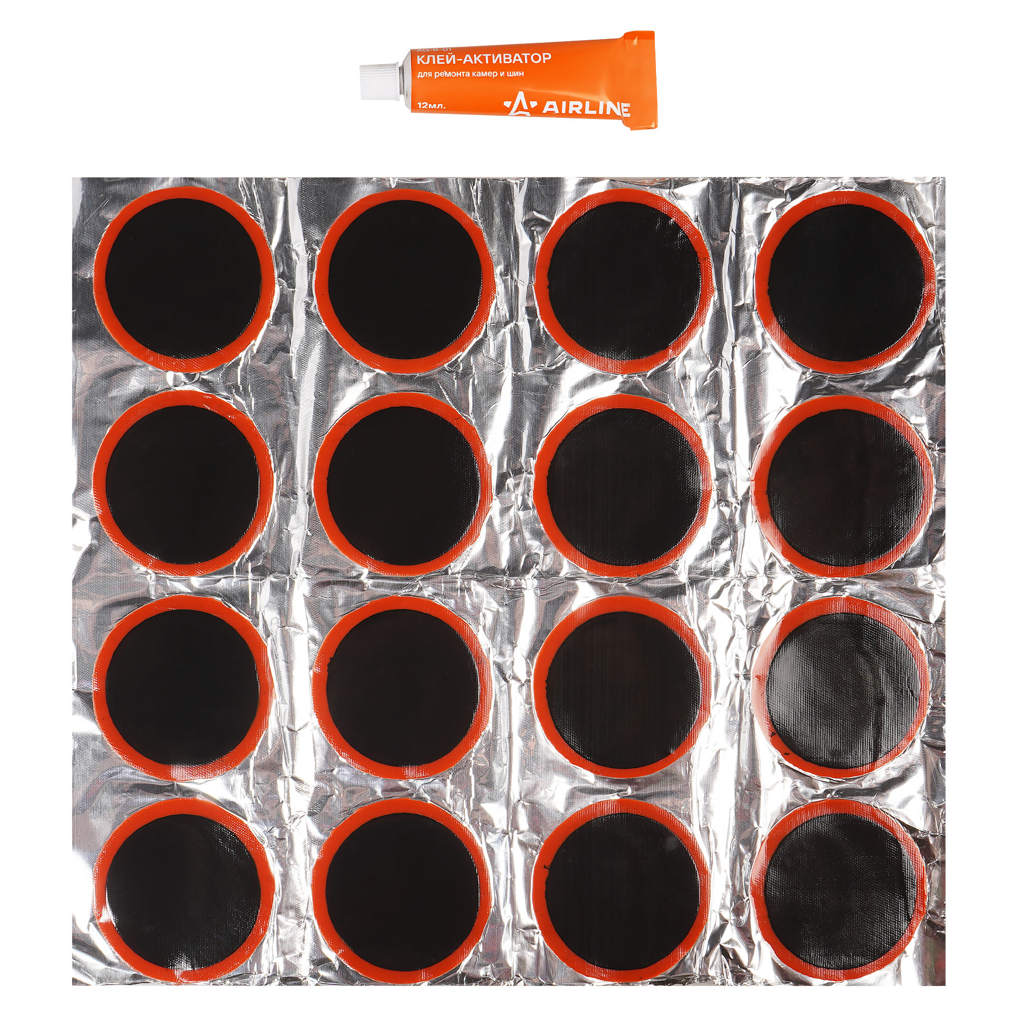 Ремкомплект для камер, заплатки круглые D50 мм - 16 шт., клей-активатор 12мл