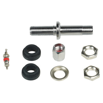 Колесный вентиль представляет собой обратный клапан. Он предназначен для нагнетания и удержания воздуха внутри шины. Корпус, золотник и колпачек выполнены из латуни, прокладка - из резины. Диаметр отверстия в диске - 11.5 мм. Рабочее давление - до 14 bar.