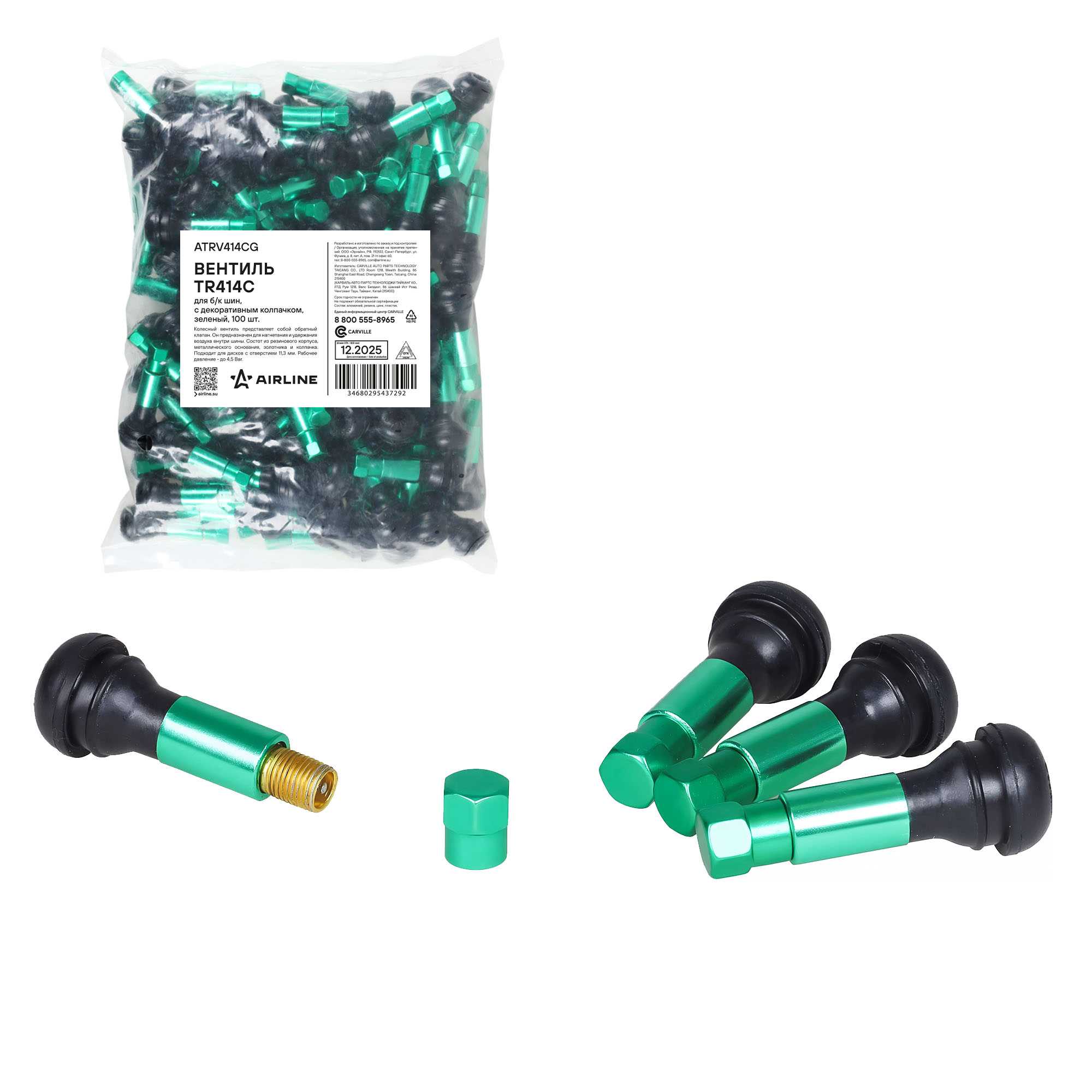 Вентиль для б/к шин TR414C c декор. колпачком, зеленый